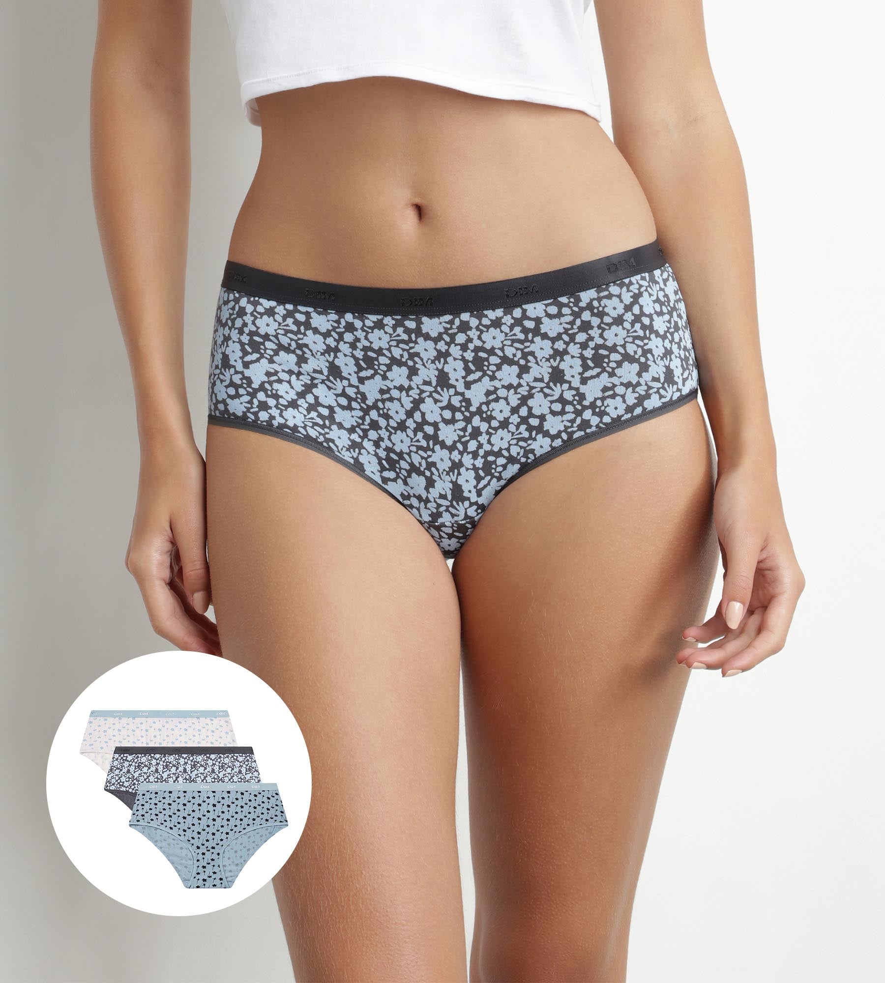 3er-Pack blaue Hipster aus Stretch-Baumwolle mit Blumenmuster – Pockets