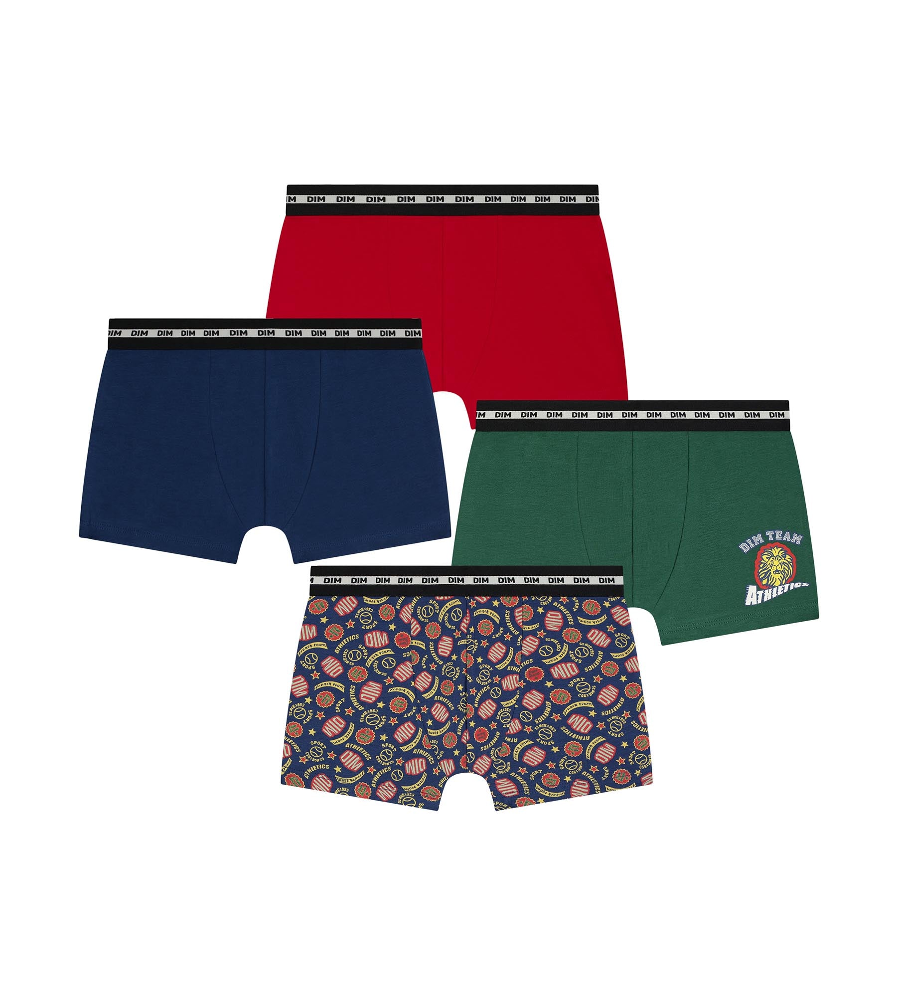 Dieses 4er-Pack Boxershorts für Jungen aus Stretch-Baumwolle von Dim ist für Fans von Sport und dynamischen Looks gedacht. Das erste Modell setzt auf ein Allover-Baseball-Design: Bälle, Sterne, DIM-Wappen, alles auf tiefblauem Hintergrund. Die dunkelgrüne Boxershorts mit einem „Athletics”-Löwenwappen setzt den sportlichen Stil fort. Die beiden letzten Dim-Boxershorts für Kinder, eine in kräftigem Rot und eine in Marineblau, bieten schlichtere, aber dennoch farbenfrohe Optionen. Dank der Stretch-Baumwolle und der Verstärkung vorne hält jede Boxershorts problemlos dem Rhythmus zwischen Schule, Sport und Spielen im Freien stand, ohne an Halt oder Weichheit einzubüßen.