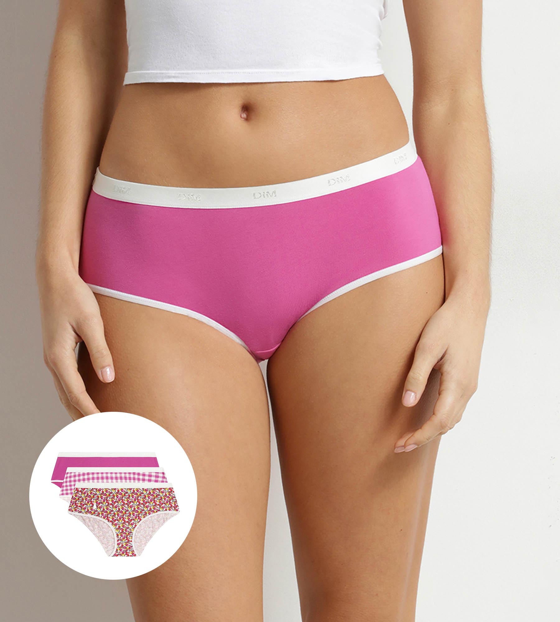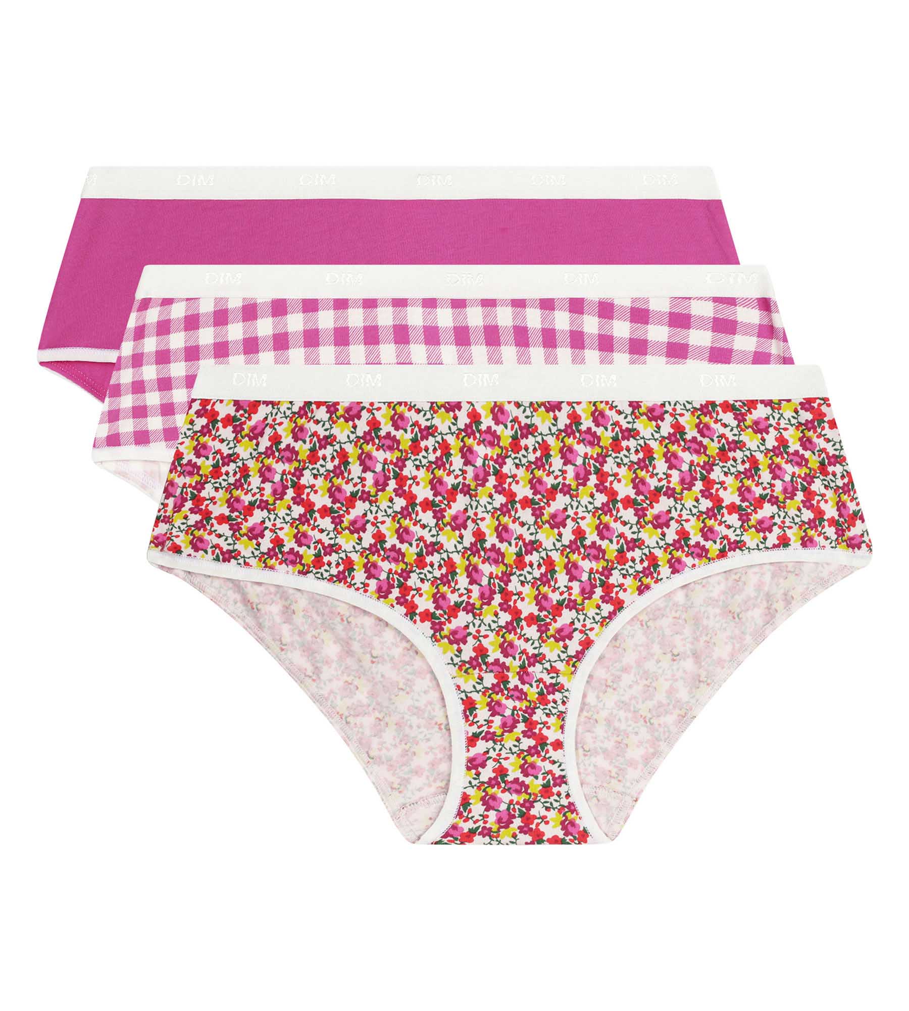 Verliebe dich in den ländlichen Stil des 3er-Packs Damen-Boxershorts Les Pockets von Dim aus Stretch-Baumwolle mit Blumen- und Vichy-Karomuster.