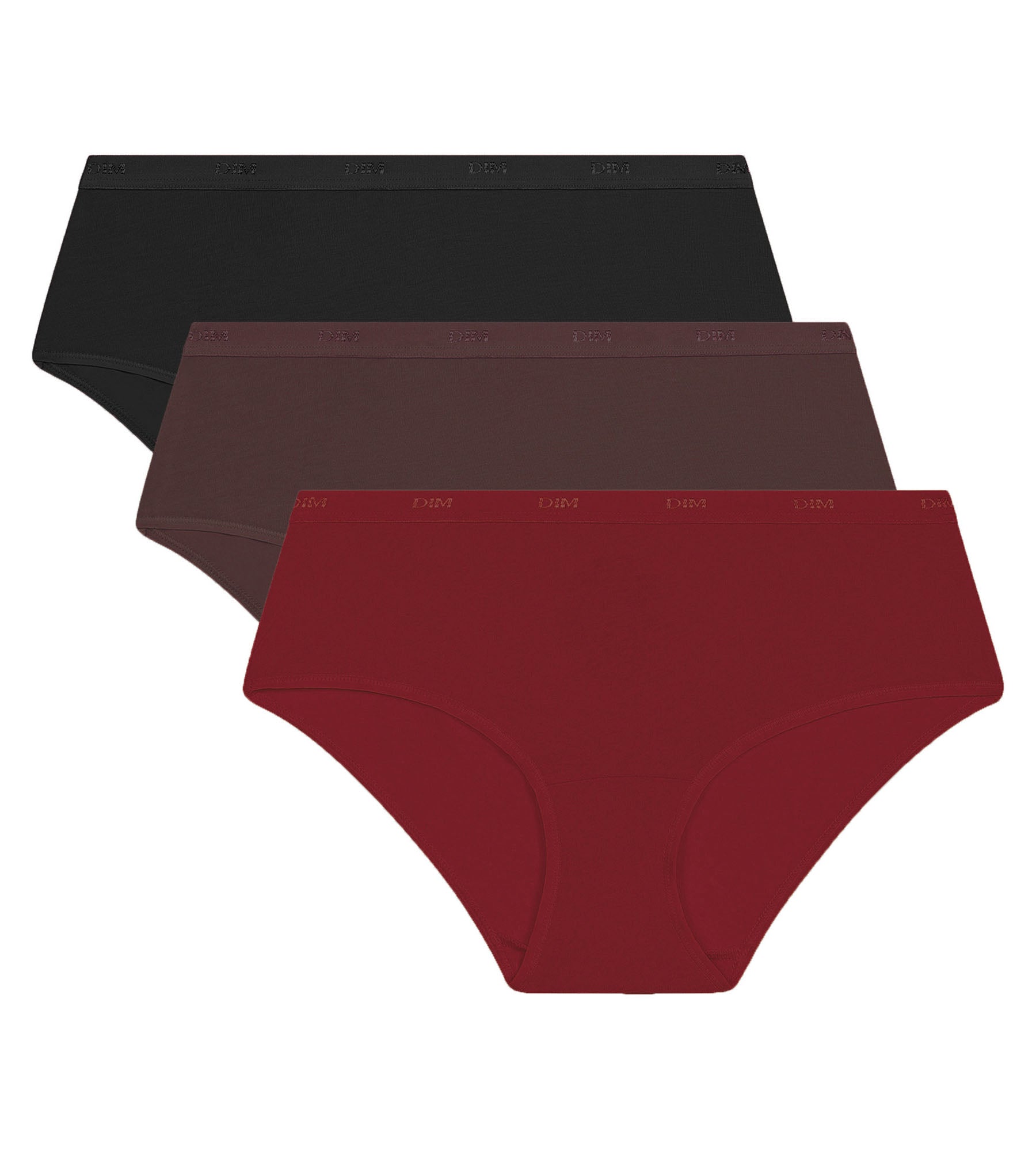 Verleihen Sie Ihrer Unterwäsche Charakter mit diesem 3er-Pack Damen-Boxershorts Les Pockets Ecodim aus Stretchbaumwolle in den Farben Cacao, Rot und Schwarz.