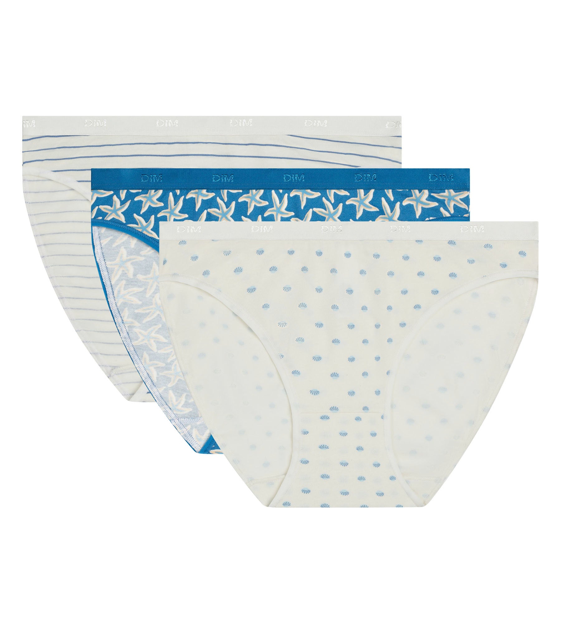 Zeig deinen Strandlook mit dem 3er-Pack Damenunterhosen Les Pockets von Dim aus Stretch-Baumwolle, deren Farben und Muster vom Meer inspiriert sind.