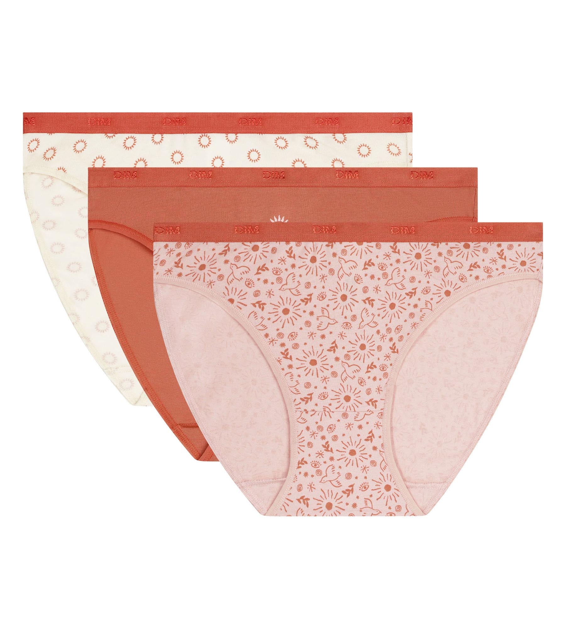Bring Schwung in deine Unterwäscheschublade mit dem 3er-Pack Damen-Slips Les Pockets von Dim aus Stretch-Baumwolle mit Sonnenprint.