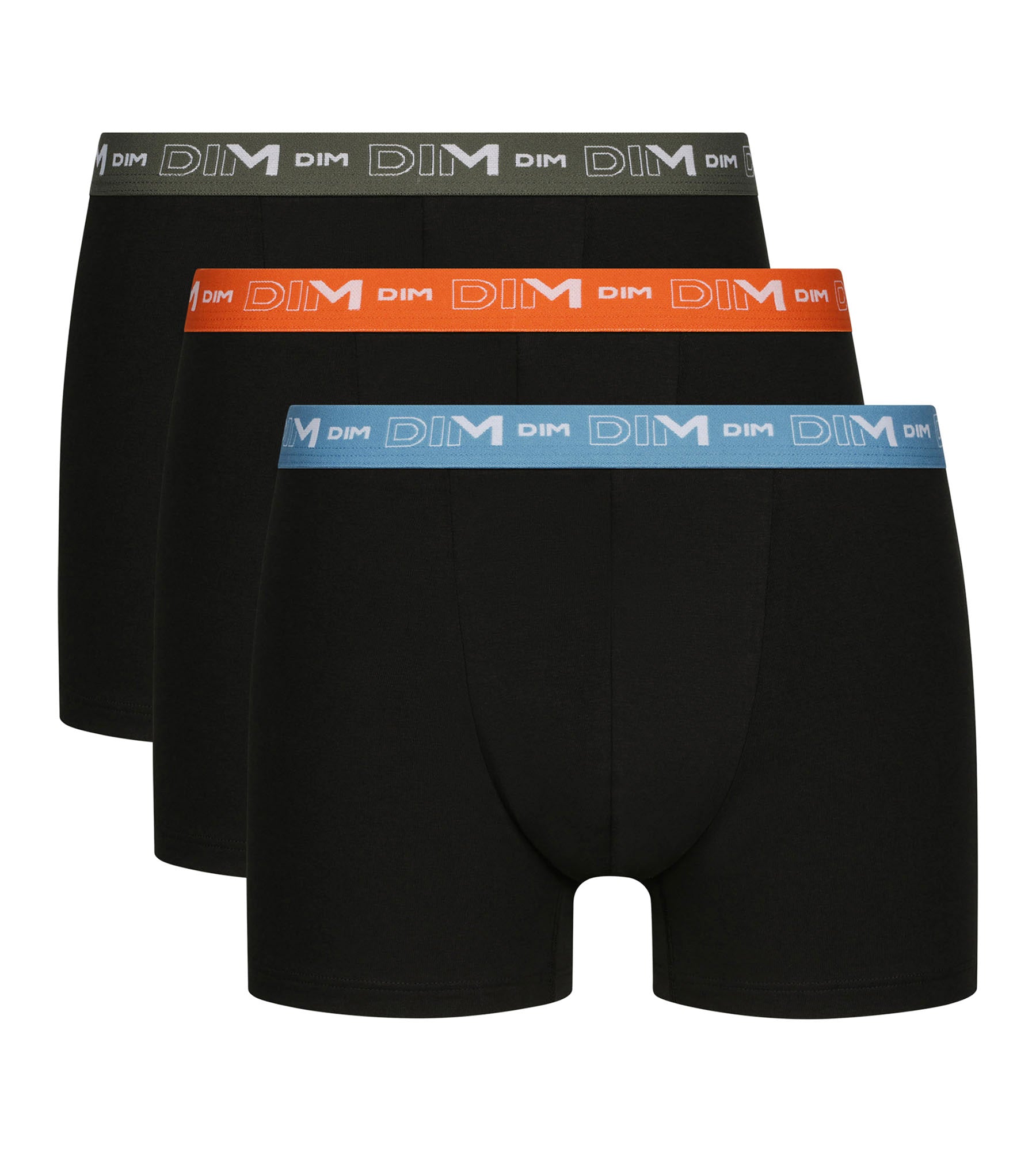 Setze auf Komfort und Farbe mit dem 3er-Pack Boxershorts für Männer Dim Coton Stretch in Schwarz mit blauem, orangefarbenem und grünem Bund!