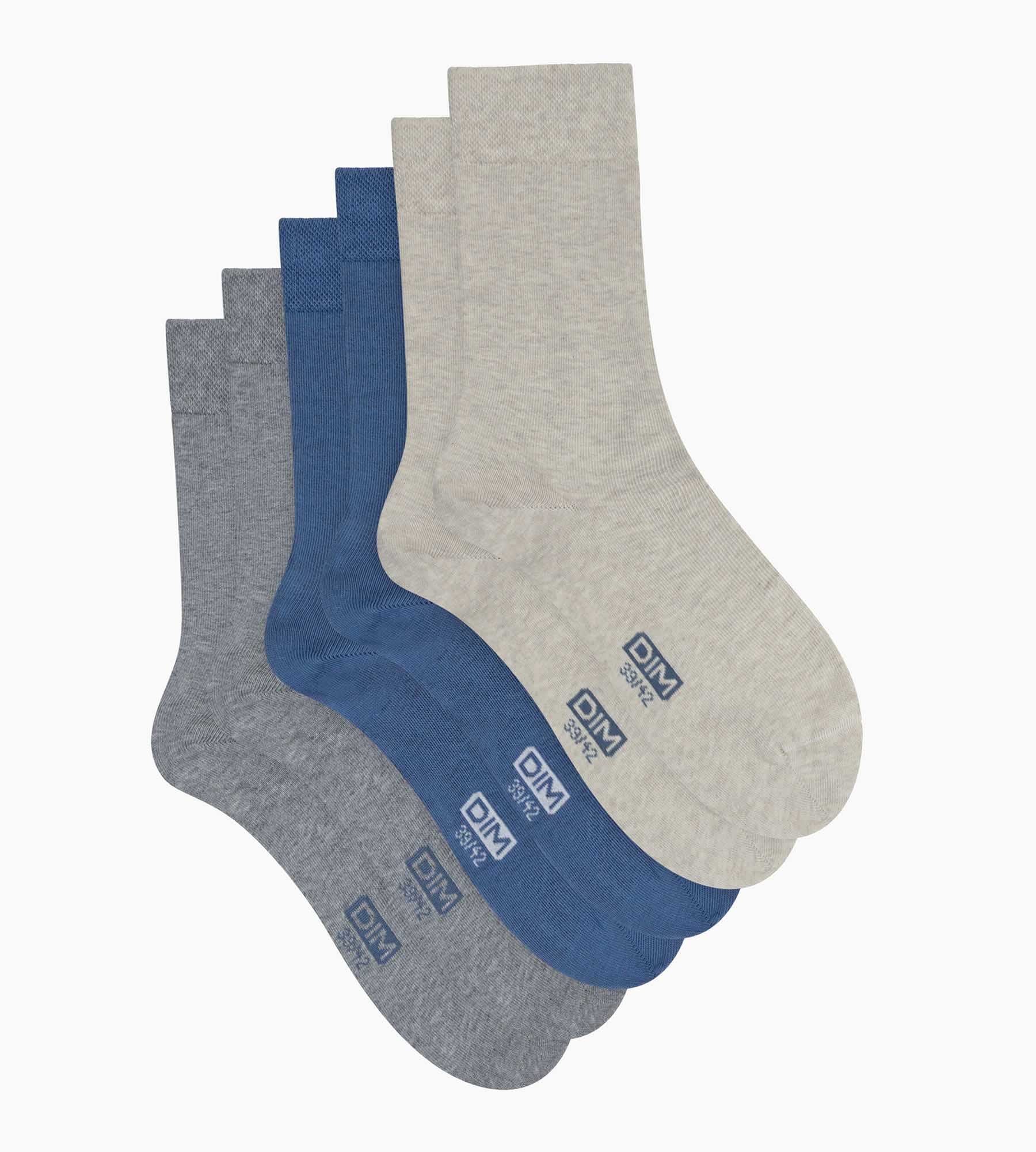 Dieses Trio einfarbiger Herrensocken von Dim setzt auf sanfte, leicht zu kombinierende Farbtöne. Das Paar in Fjordblau verleiht einen dezenten maritimen Touch, die hellgrauen Socken bleiben neutral und lässig, während die melierten beigen Socken Outfits auf dezente Weise aufwerten. Das glatte Baumwollgewebe fühlt sich angenehm auf der Haut an und die verstärkten Fersen und Spitzen machen jedes Paar besonders langlebig. Ein unverzichtbares Set, das jede Saison überdauert, ohne jemals aus der Mode zu kommen.