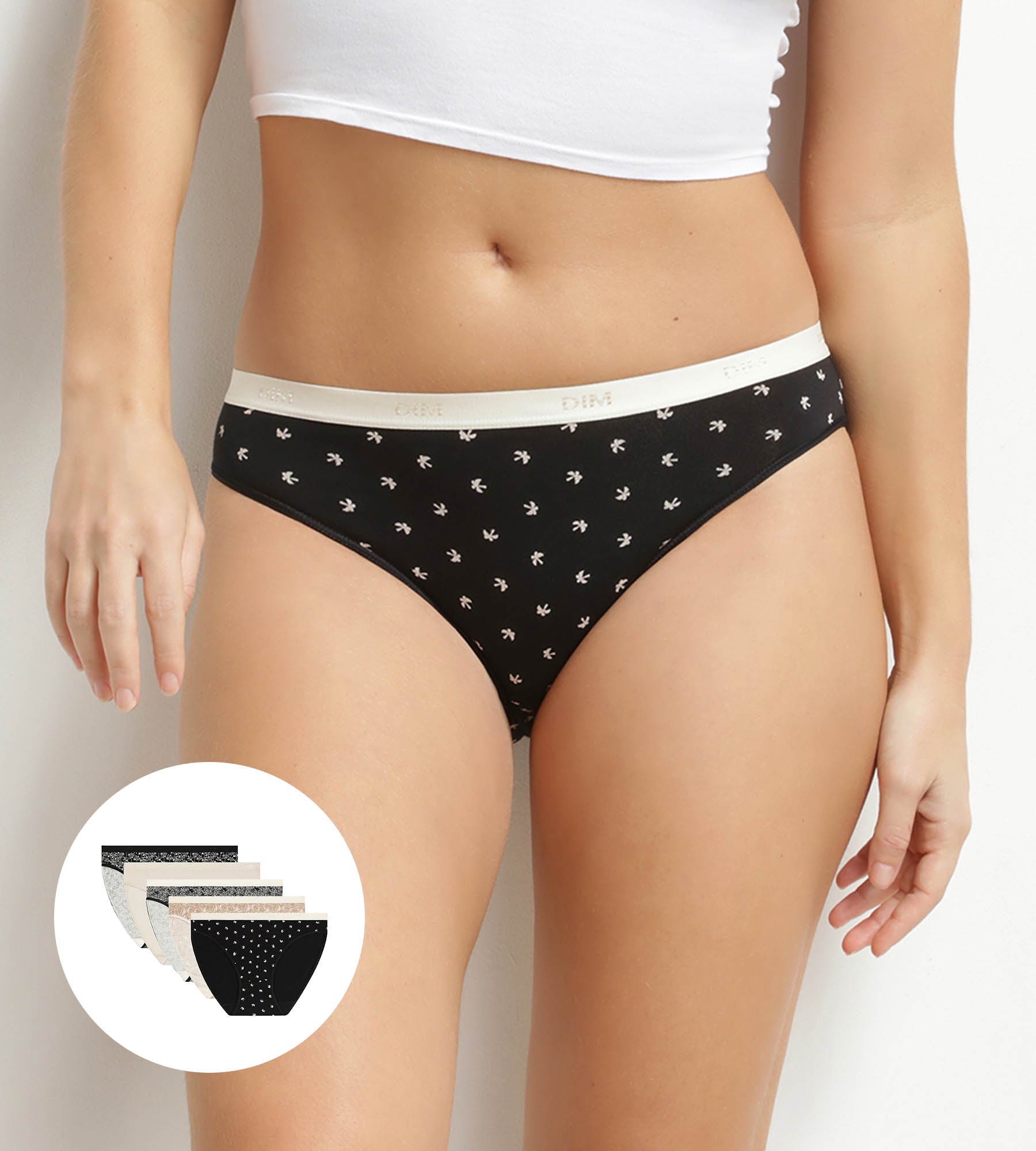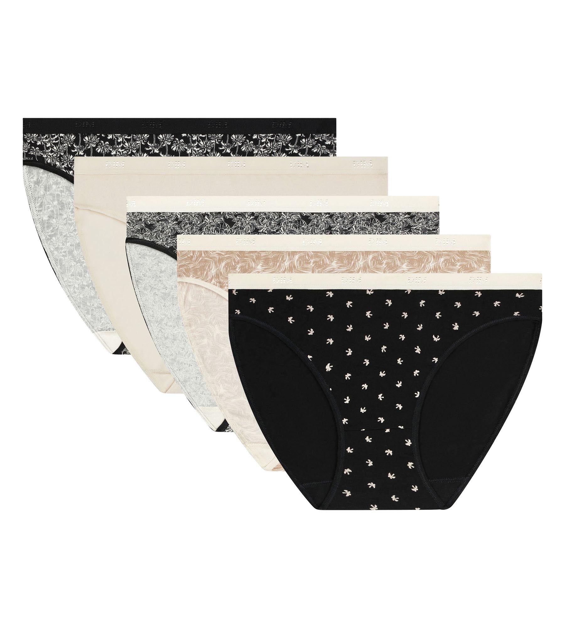 Entfliehe dem Alltag mit dem 5er-Pack Damenunterhosen Les Pockets von Dim aus Stretch-Baumwolle mit dezenten exotischen Mustern.