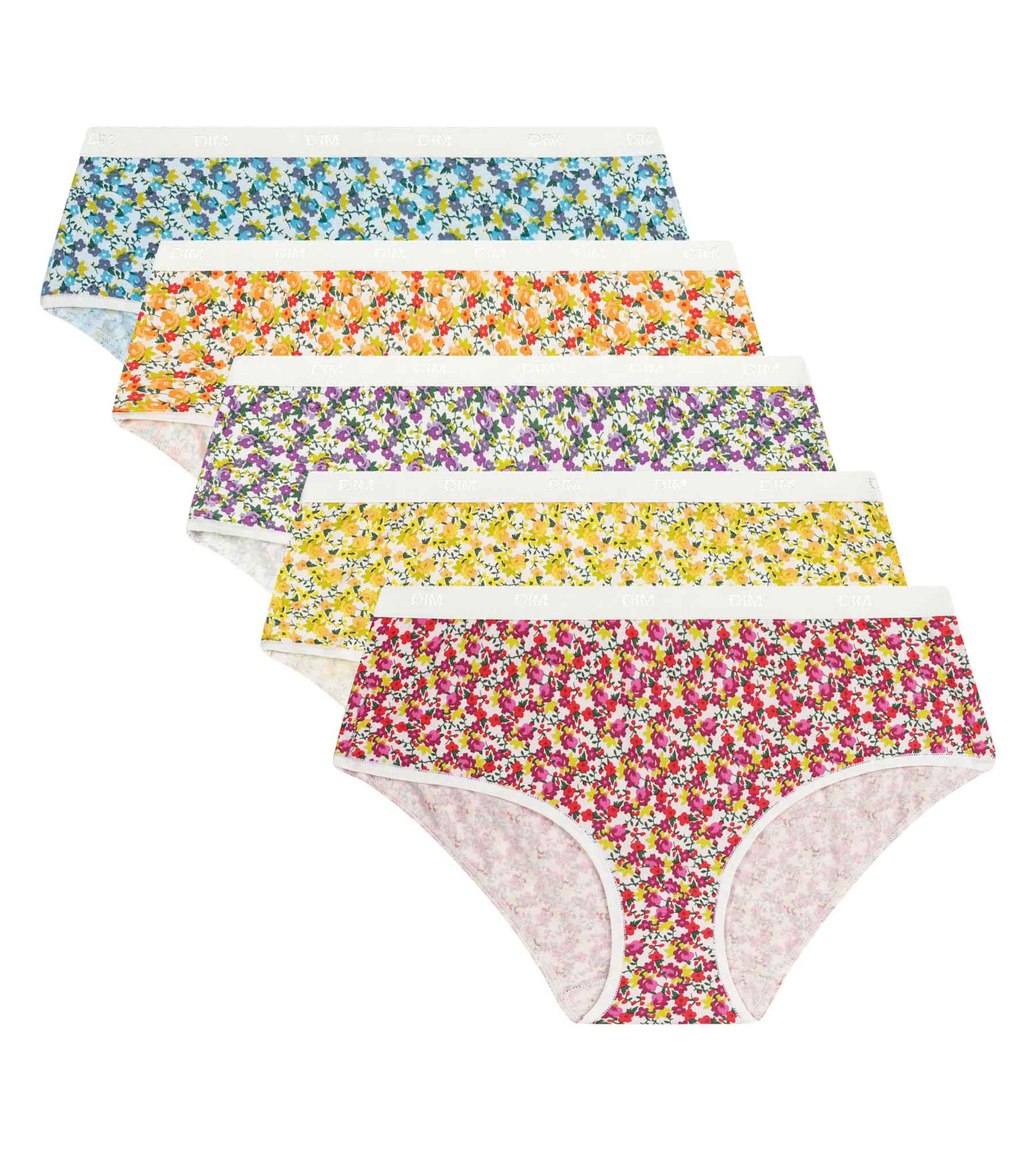 Bring frischen Wind in deine Unterwäsche mit dem 5er-Pack Damenboxershorts von Les Pockets von Dim aus Stretch-Baumwolle mit bunten Blumenmustern.