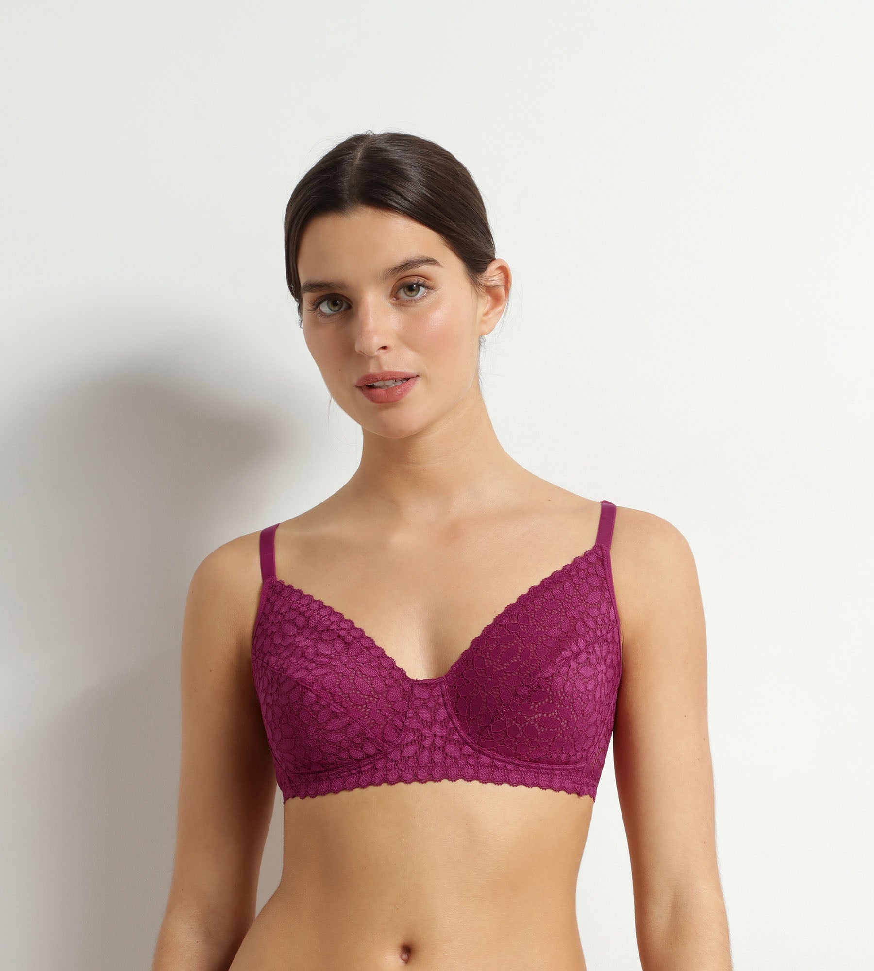 Der leichte Triangel-BH Daily Dentelle Dim umhüllt die Brust mit einem Schleier aus zarter Spitze. Sein fließender Schnitt fühlt sich an wie eine zweite Haut, während der V-Ausschnitt die Brust auf natürliche Weise formt. Dank seiner dehnbaren Spitze und seiner besonders bequemen Konstruktion sorgt dieser BH ohne Bügel für maximale Bewegungsfreiheit. In der satten und leuchtenden Farbe „Fruits des Bois” verbindet dieser Spitzen-BH Modernität und Sinnlichkeit und ist dabei trotzdem bequem zu tragen.