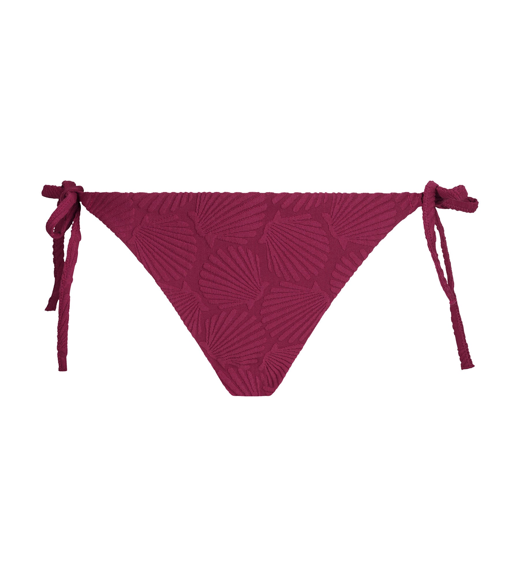 Weich, leicht und ein bisschen verspielt: Das Bindehöschen von Dim Swimwear aus rotem Jacquard mit Muschelmuster zelebriert die Freiheit des Körpers und die Sanftheit des Sommers.