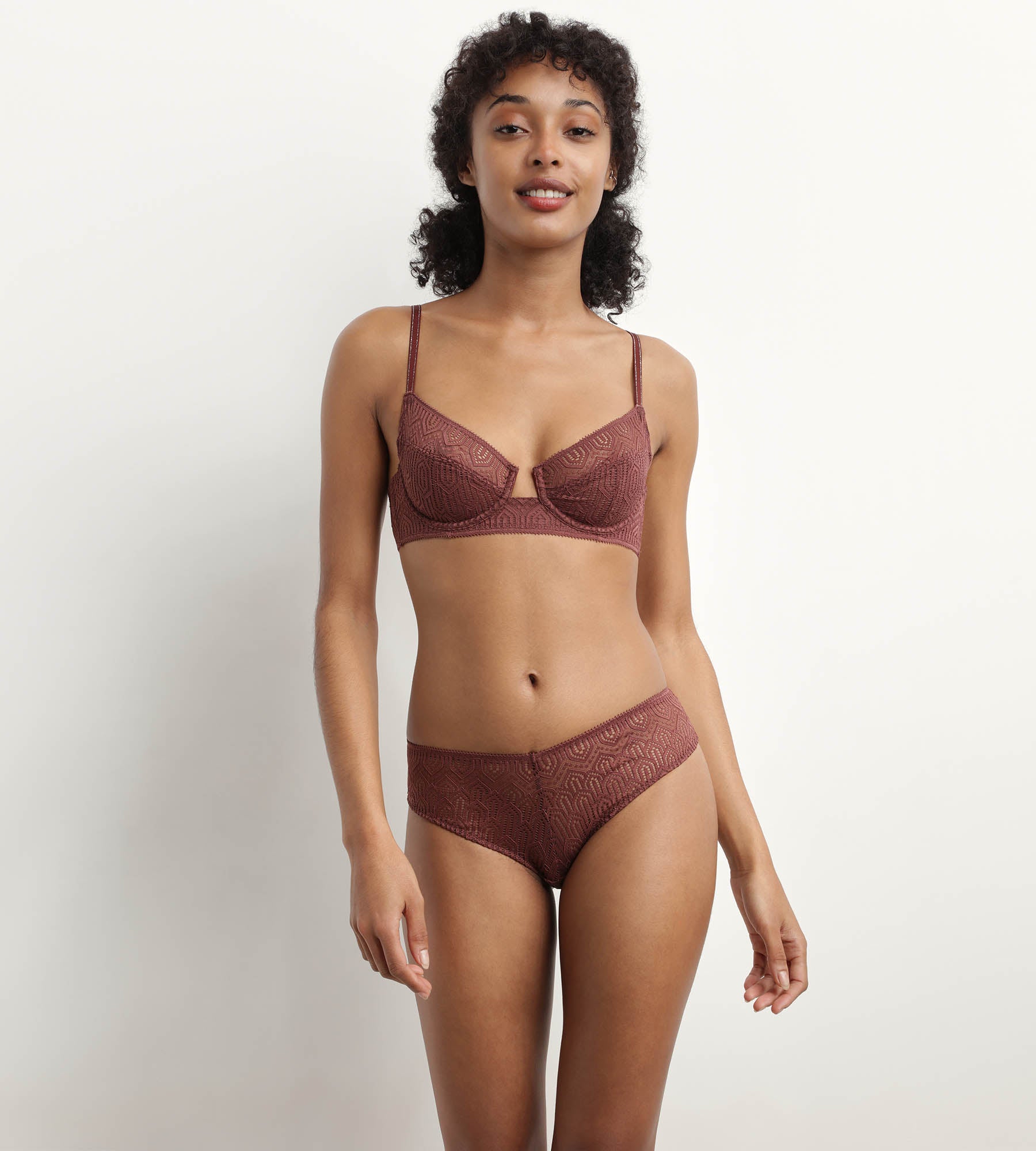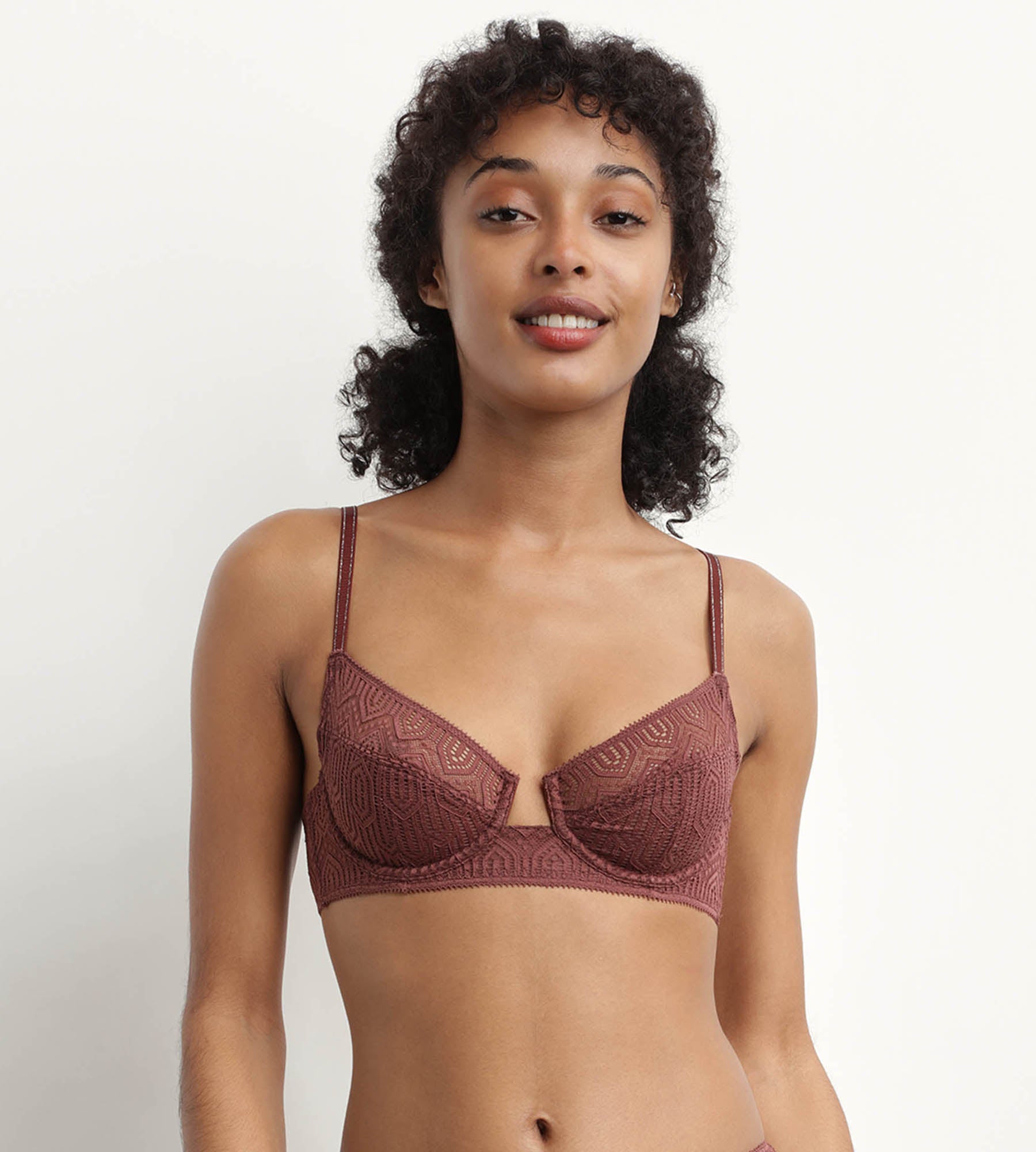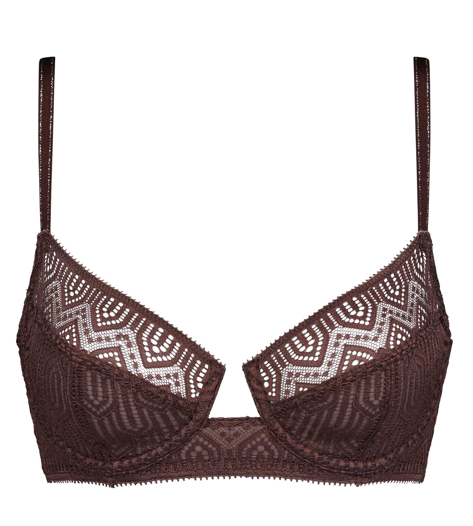 Verlieb' Dich in den intensiven Kakaoton unseres Mod de DIM Bügel-BHs aus Art Deco Spitze – einfach zum Anbeißen! Dank des leichten Push-up-Effekts und des tiefen Mittelstegs setzt der Dein Dekolleté besonders verführerisch in Szene.