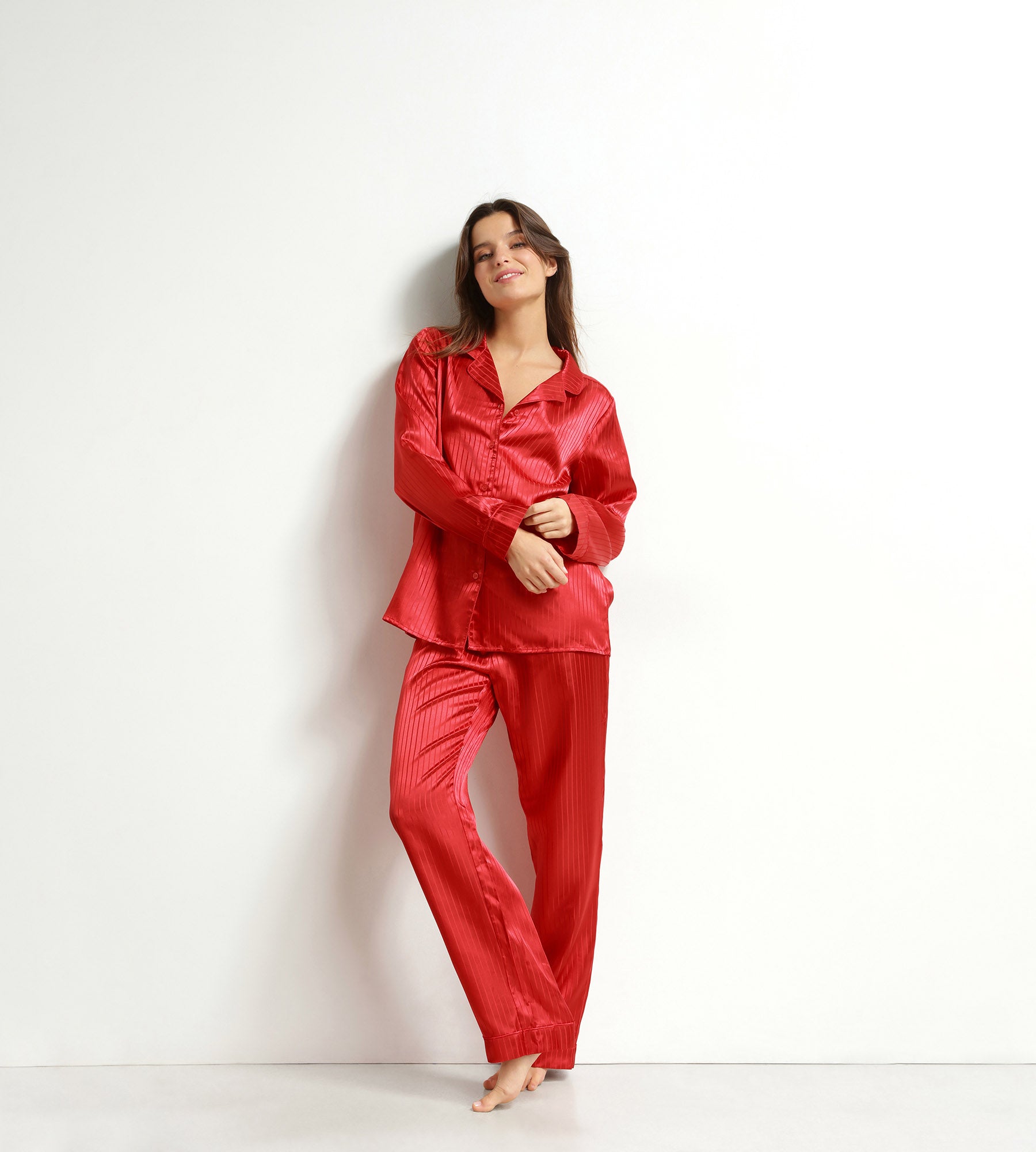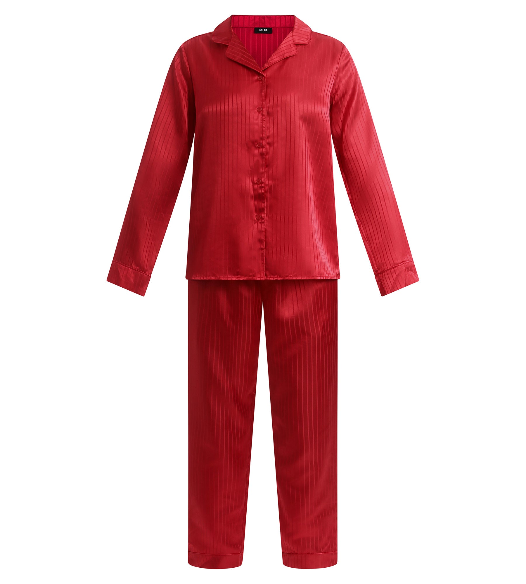 Dieser Pyjama für Damen aus der Don’t Disturb-Kollektion von Dim wurde für alle entwickelt, die auch zu Hause nicht auf Stil verzichten wollen, und setzt auf satinierte Eleganz. Das leuchtende Rouge Valentin sorgt für Charakter, der glänzende Streifeneffekt für Relief und die kontrastierende Borte für einen Hauch von Couture. Das langärmelige Hemd und die weite Hose bieten volle Bewegungsfreiheit und formen gleichzeitig eine feminine, lässige Silhouette. Ein Set, das deine gemütlichen Abende zu einem modischen Erlebnis macht!