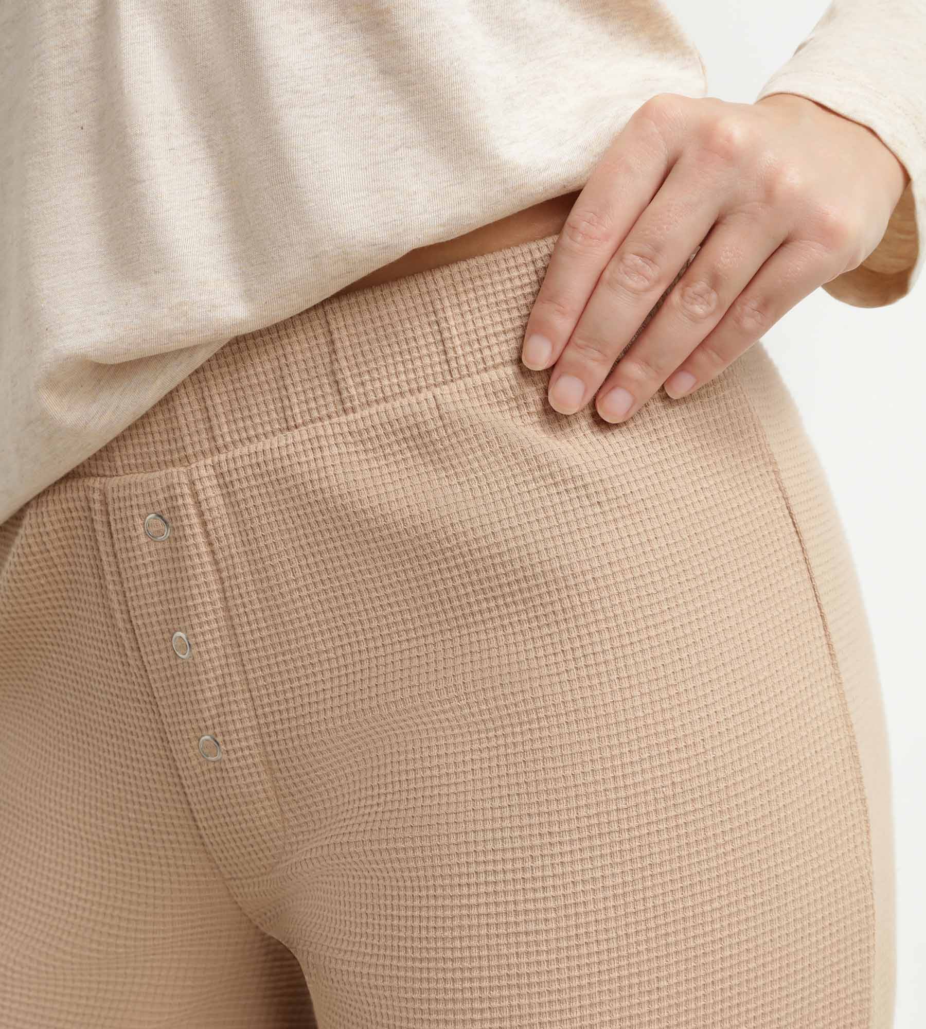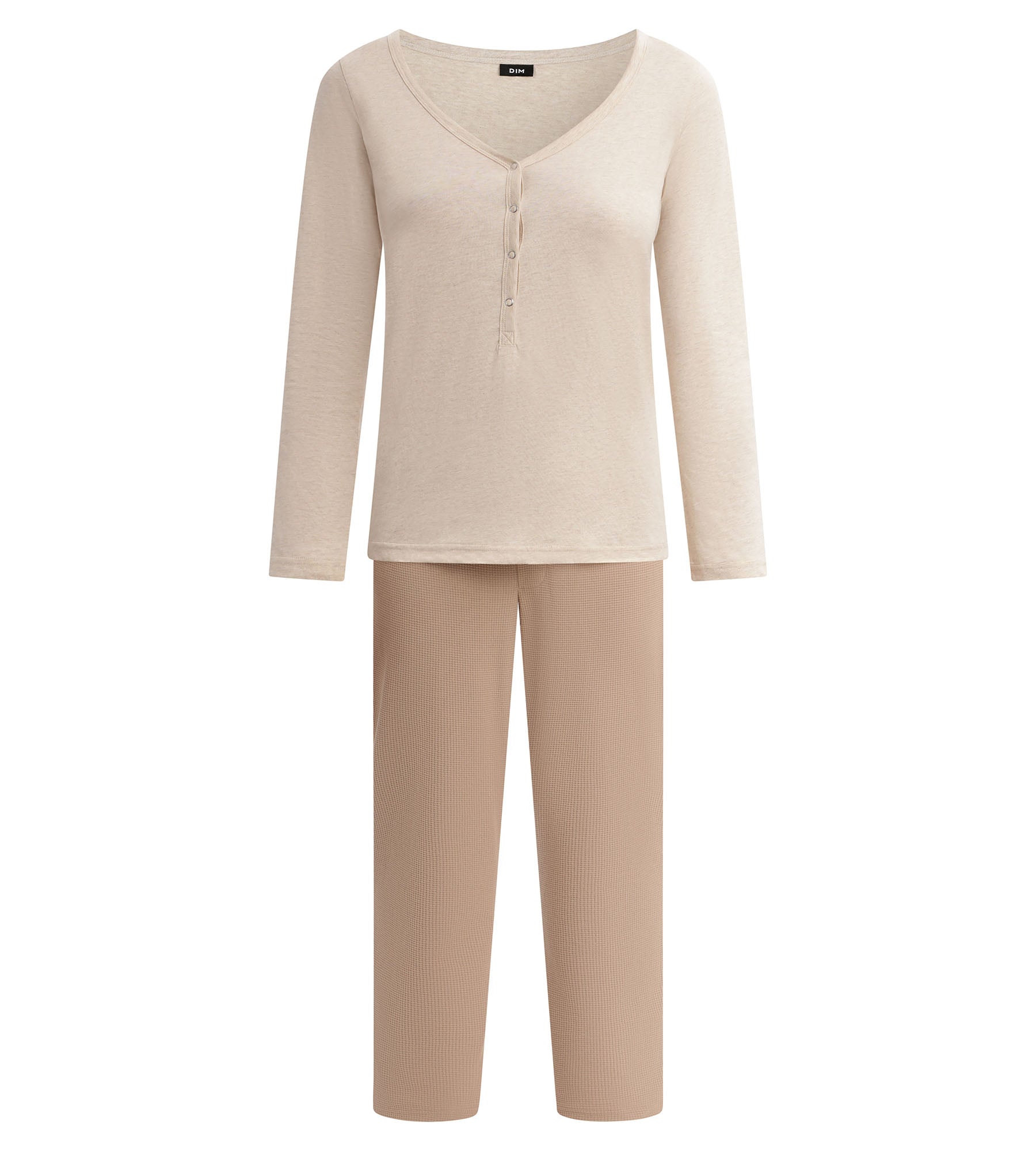 Dieser Pyjama von Dim für Damen ist perfekt für gemütliche Morgenstunden und entspannte Abende und setzt auf schlichte Eleganz. Das beigefarbene Jersey-Oberteil sorgt für Helligkeit, während das taupefarbene Unterteil das Ensemble in einer natürlichen und modernen Farbpalette verankert. Der Serafino-Schnitt mit V-Ausschnitt und Knöpfen sorgt für einen lässig-schicken Look, die gerade Hose mit niedriger Taille ist bequem, ohne einzuengen. Ein Farbdoppel, das sich an alle Cocooning-Wünsche anpasst, ohne dabei den Stil zu vernachlässigen. Die Kollektion Cosy Time präsentiert hier ein zeitloses und leicht zu tragendes Homewear-Basic!