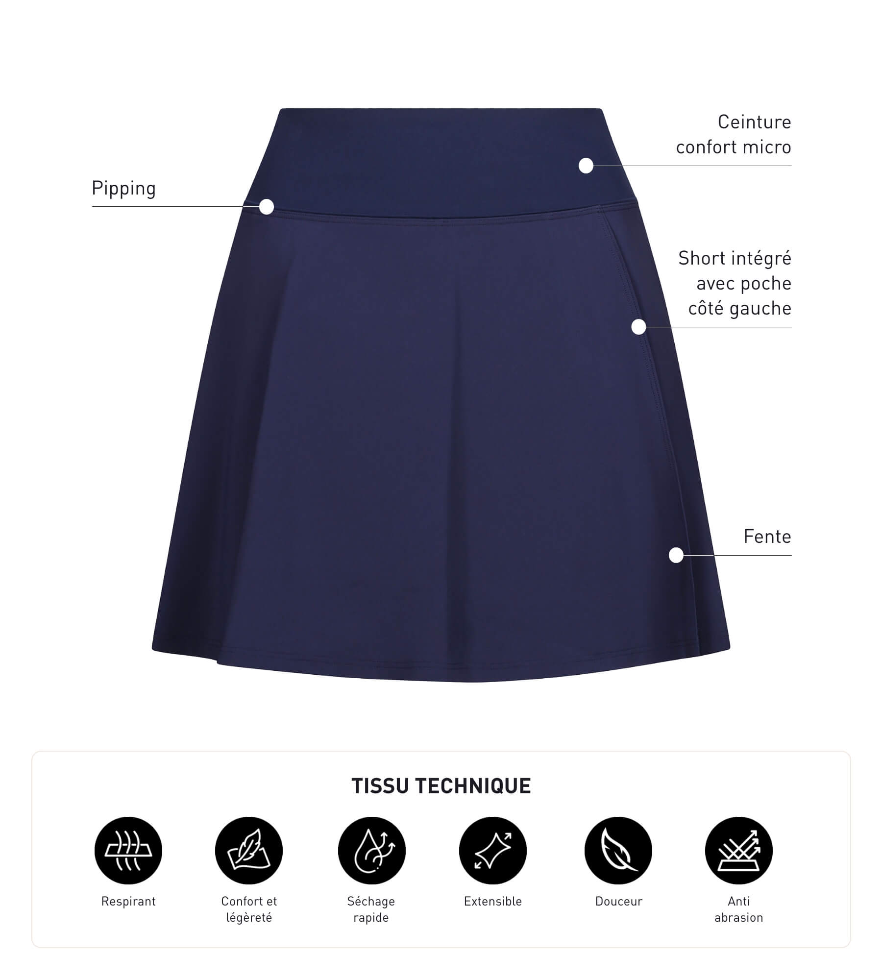 Der kurze Rock aus nachtblauer Mikrofaser von Dim Move wurde entwickelt, um einen sportlichen Look mit totaler Freiheit zu verbinden. Er ist Ihr Leistungsvorteil!