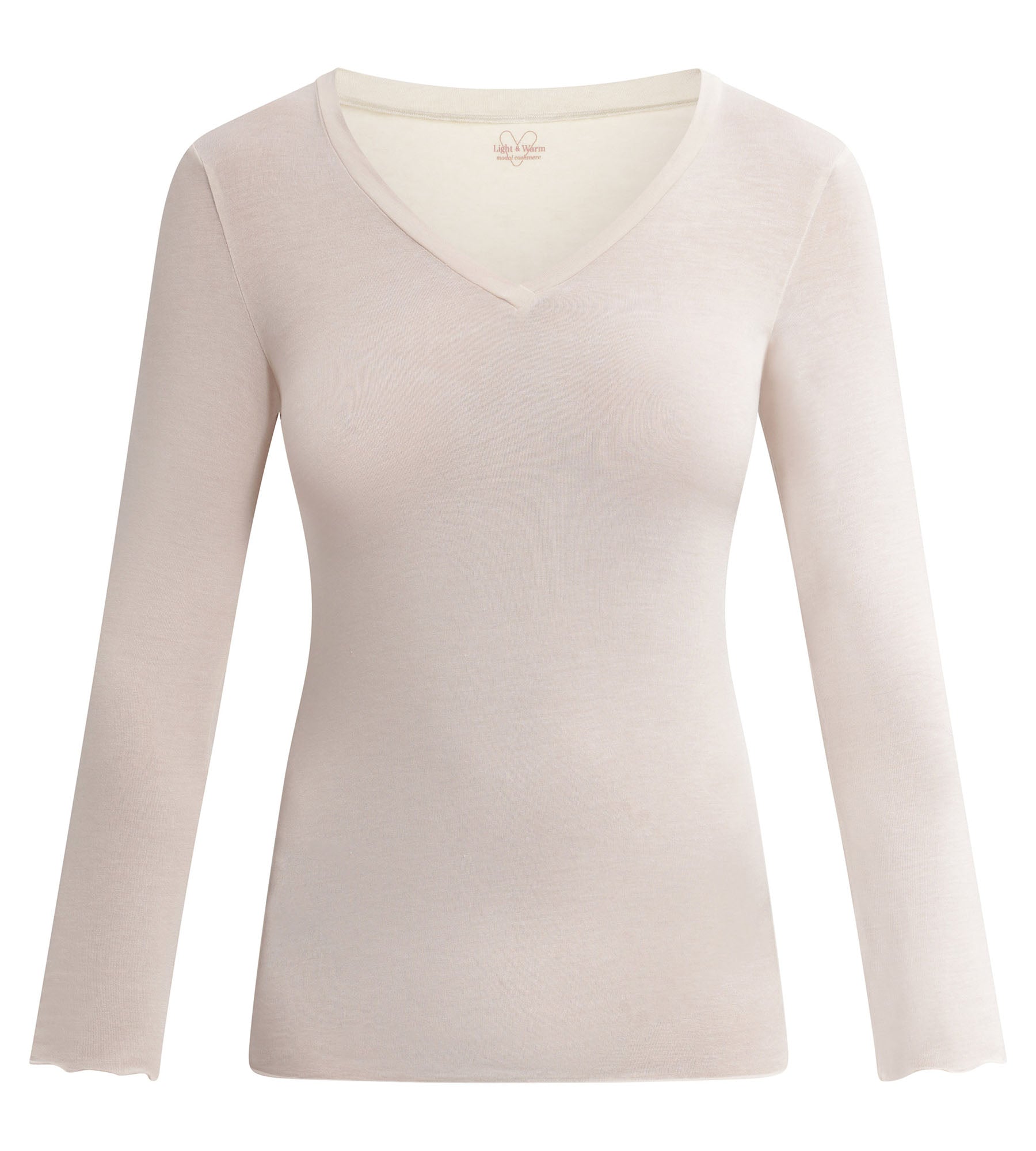 Kombinieren Sie Wärme, Leichtigkeit und Feminität mit dem langärmeligen T-Shirt mit V-Ausschnitt Light & Warm in Beige Lavé, dem idealen Kleidungsstück für die Übergangszeit.