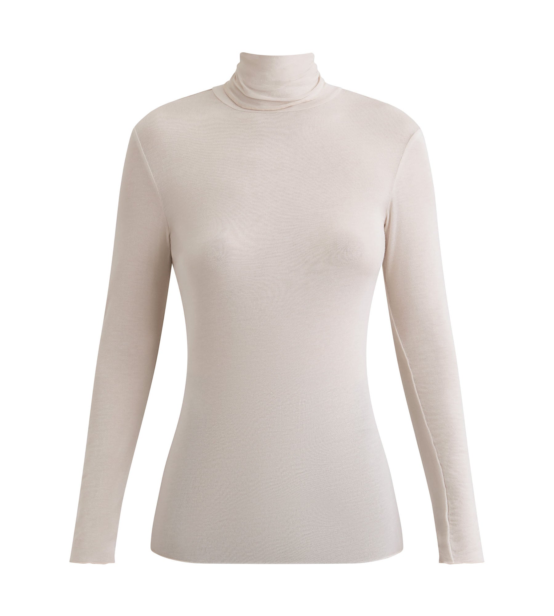 Mit dem Dim Thermal x Ines de la Fressange Damen T-Shirt mit Stehkragen aus feinem Strick Beige Lavé.