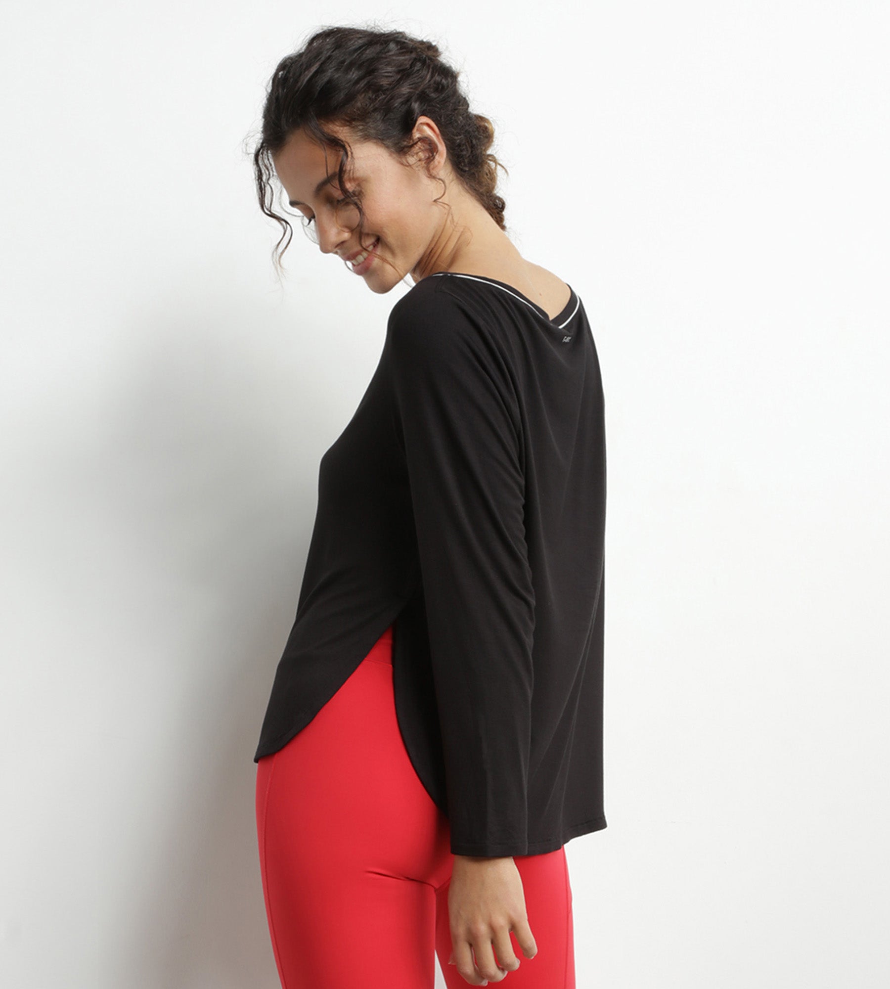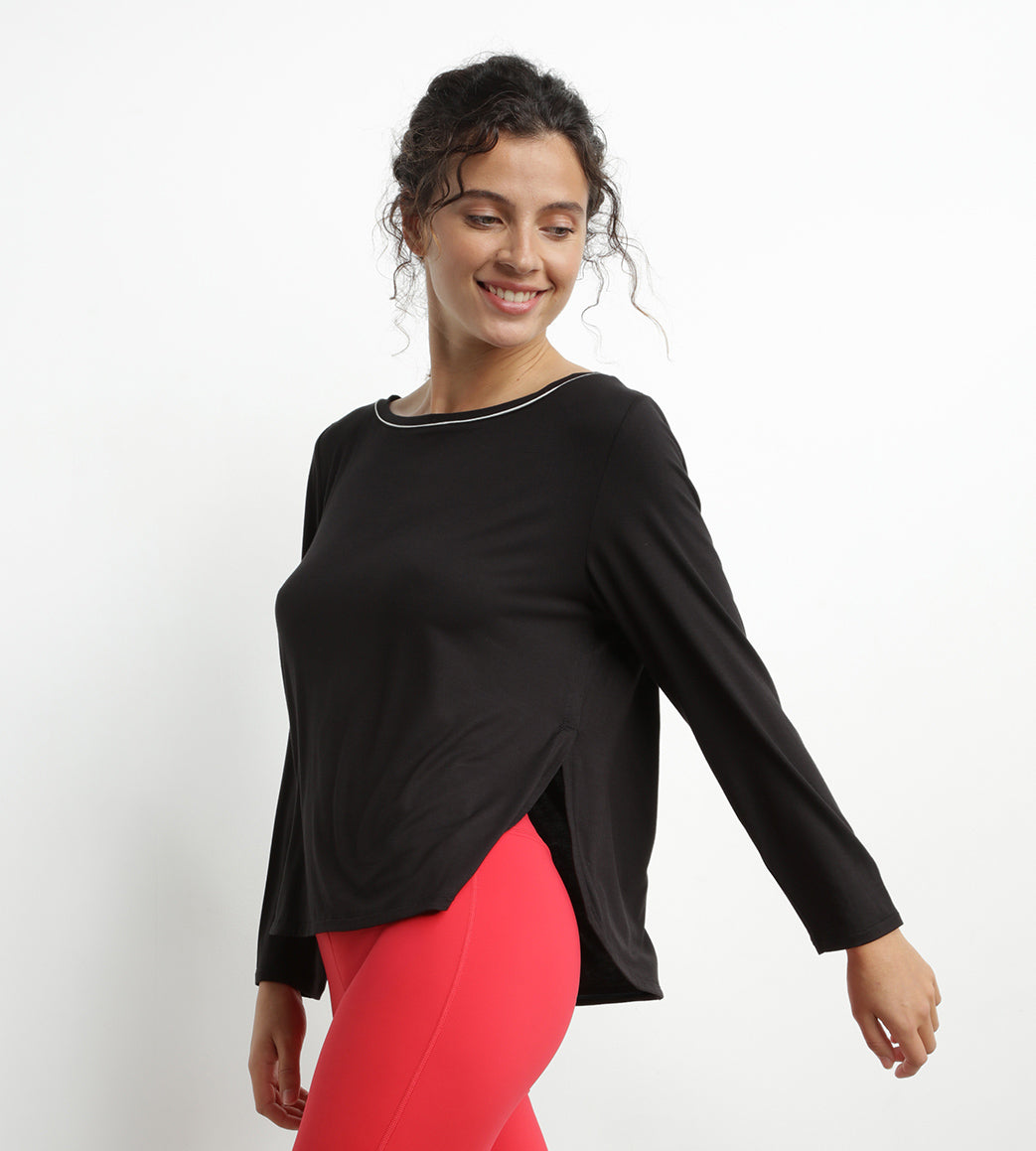 Aus weichem, fließendem Material, mit einem lockeren Schnitt und strategischen Öffnungen, begleitet das Damen-Sportoberteil Dim Move deine Praxis mit Leichtigkeit. Mit seinem U-Boot-Kragen und dem weißen Piping verleiht das Top Noir Dim Move deinem Outfit eine trendige Note und lässt sich leicht mit unseren Sport-BHs kombinieren.
