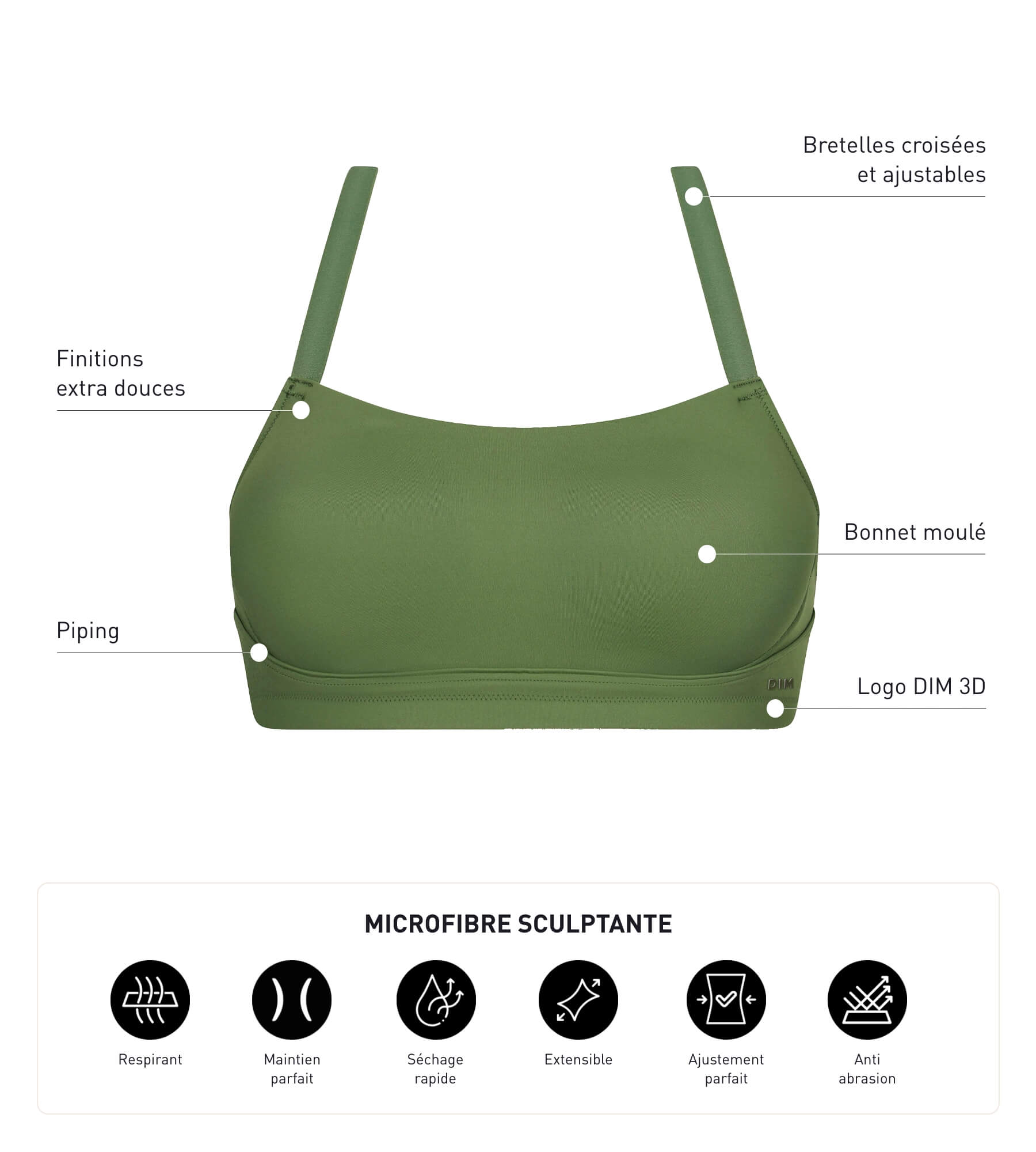 Bequem und formend, entscheiden Sie sich für den kabellosen Sport-BH Dim Move aus khakifarbener Mikrofaser!