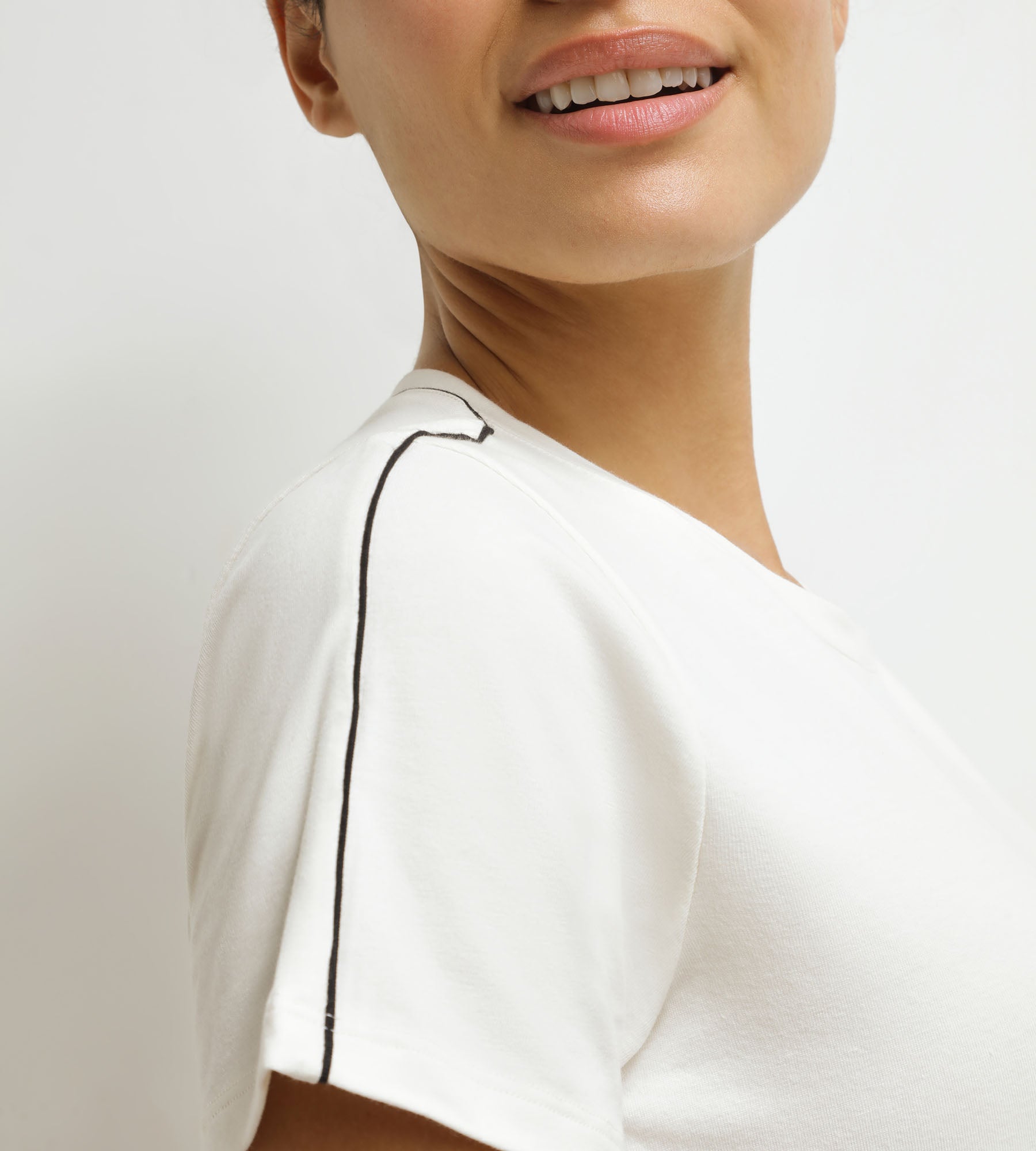 - Die Farbe Ecru mit schwarzem Piping, schlicht und athletisch.