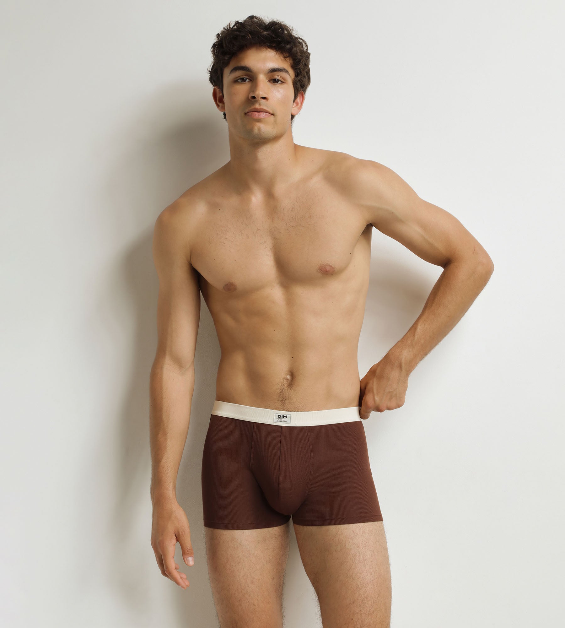 Decken Sie die Dim Elegant Boxershorts ab, die für Männer entworfen wurden, die nach praktischer und gleichzeitig stilvoller Unterwäsche suchen. Dank ihrer zirkulären Struktur und dem atmungsaktiven Material sitzt sie perfekt und fühlt sich wie eine zweite Haut an. Der elastische Taillenbund, der mit einem leicht gerafften Dim létiquette geschmückt ist, hält die Taille flexibel und schlicht. Das reine Design und die Farbe Chocolate machen diese Herren-Boxershorts aus Baumwolle zu einem zeitlosen Basic, ideal für jede Situation.