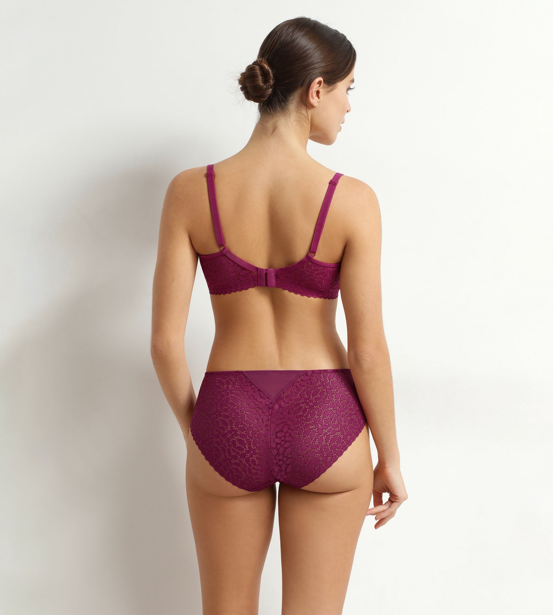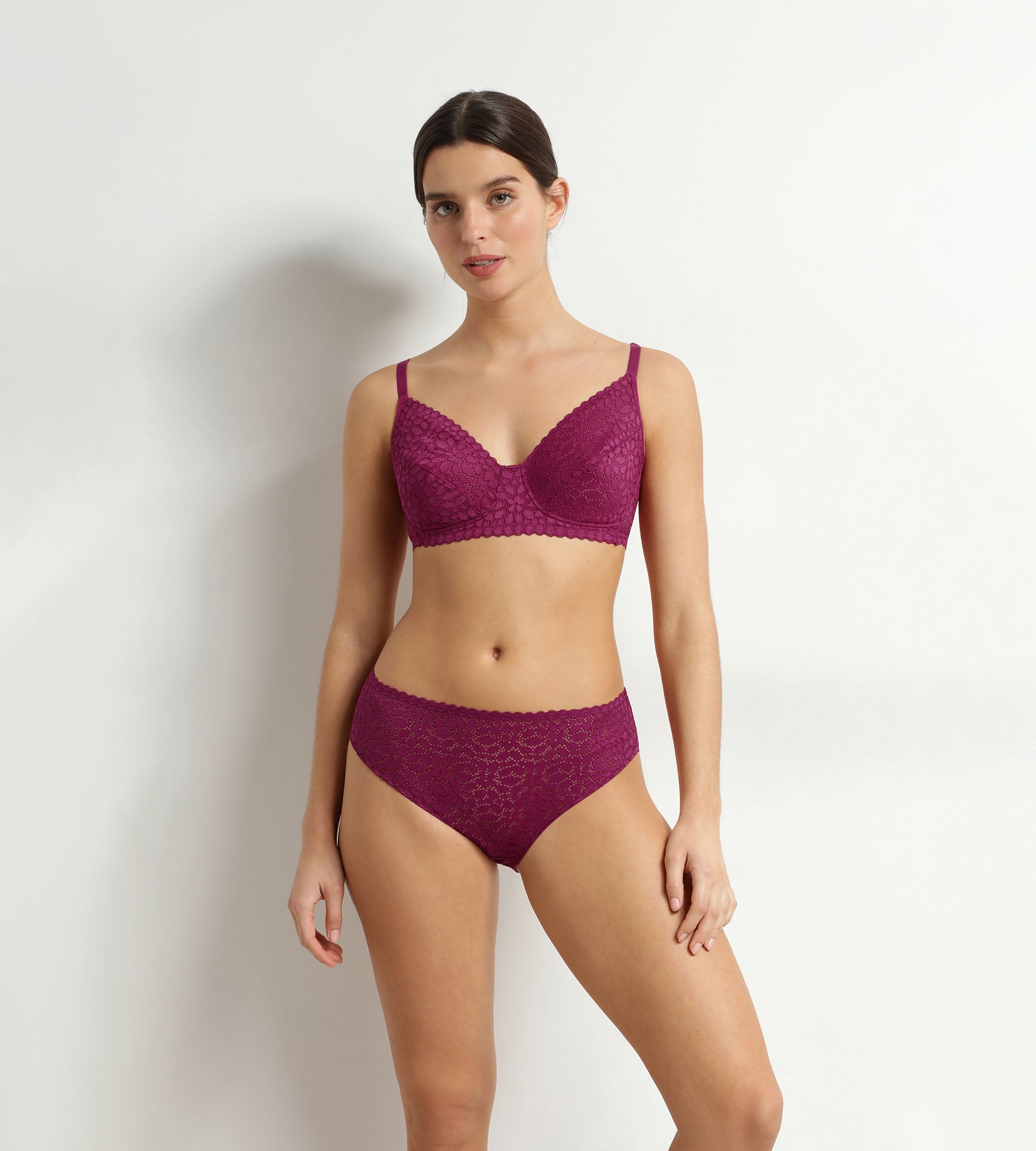 Mit ihrer weichen und atmungsaktiven Spitze verbindet die Spitzenhose Daily Dentelle Dim Eleganz und Komfort den ganzen Tag über. Ihre Midi-Form schmiegt sich sanft an Taille und Hüften an, während das durchbrochene Blumenmuster die Haut subtil durchscheinen lässt. Der satte, feminine Farbton „Fruits des Bois” verleiht diesem Damenhöschen eine lebendige Note und ist perfekt, um Stil und Wohlbefinden zu verbinden.