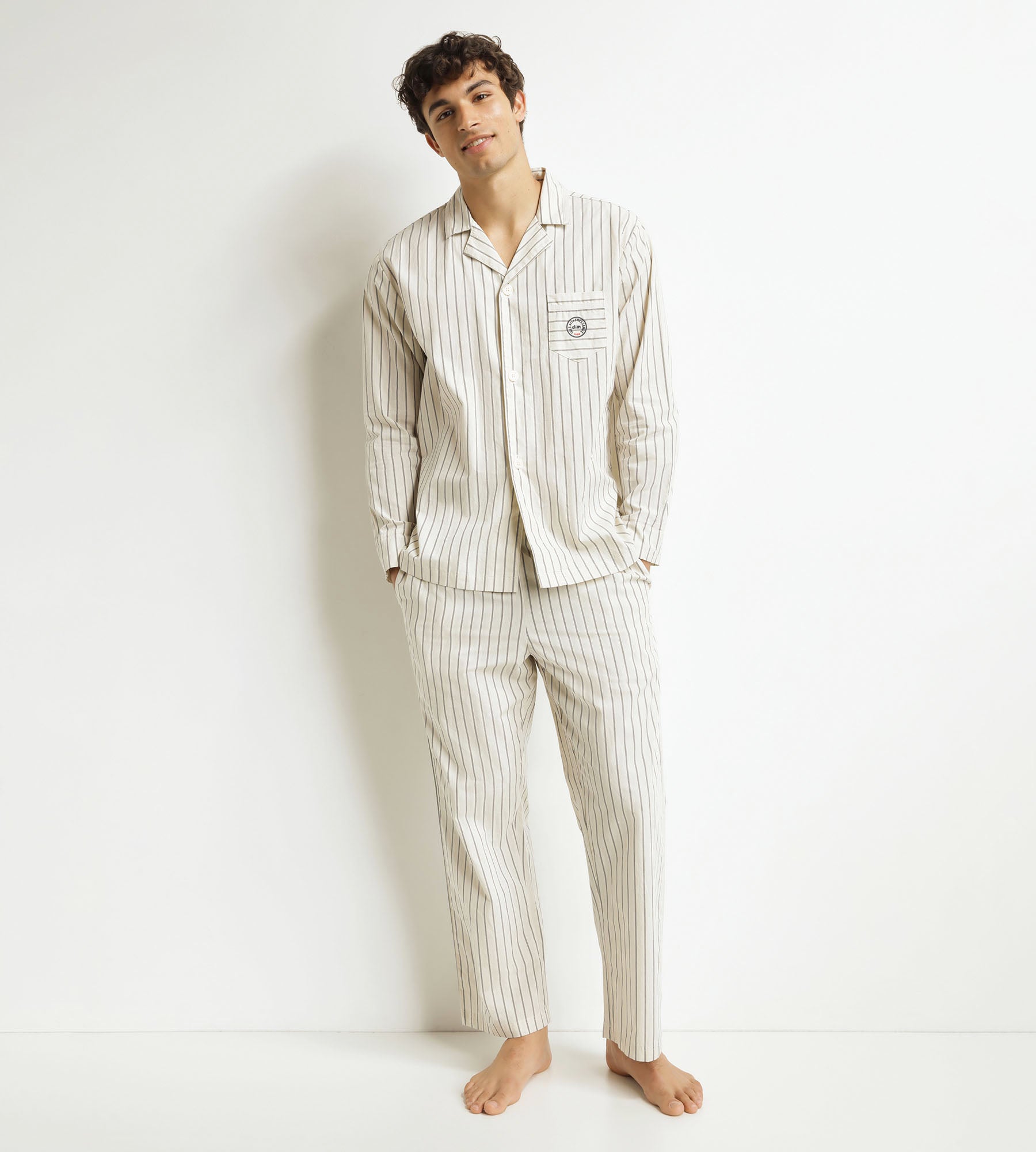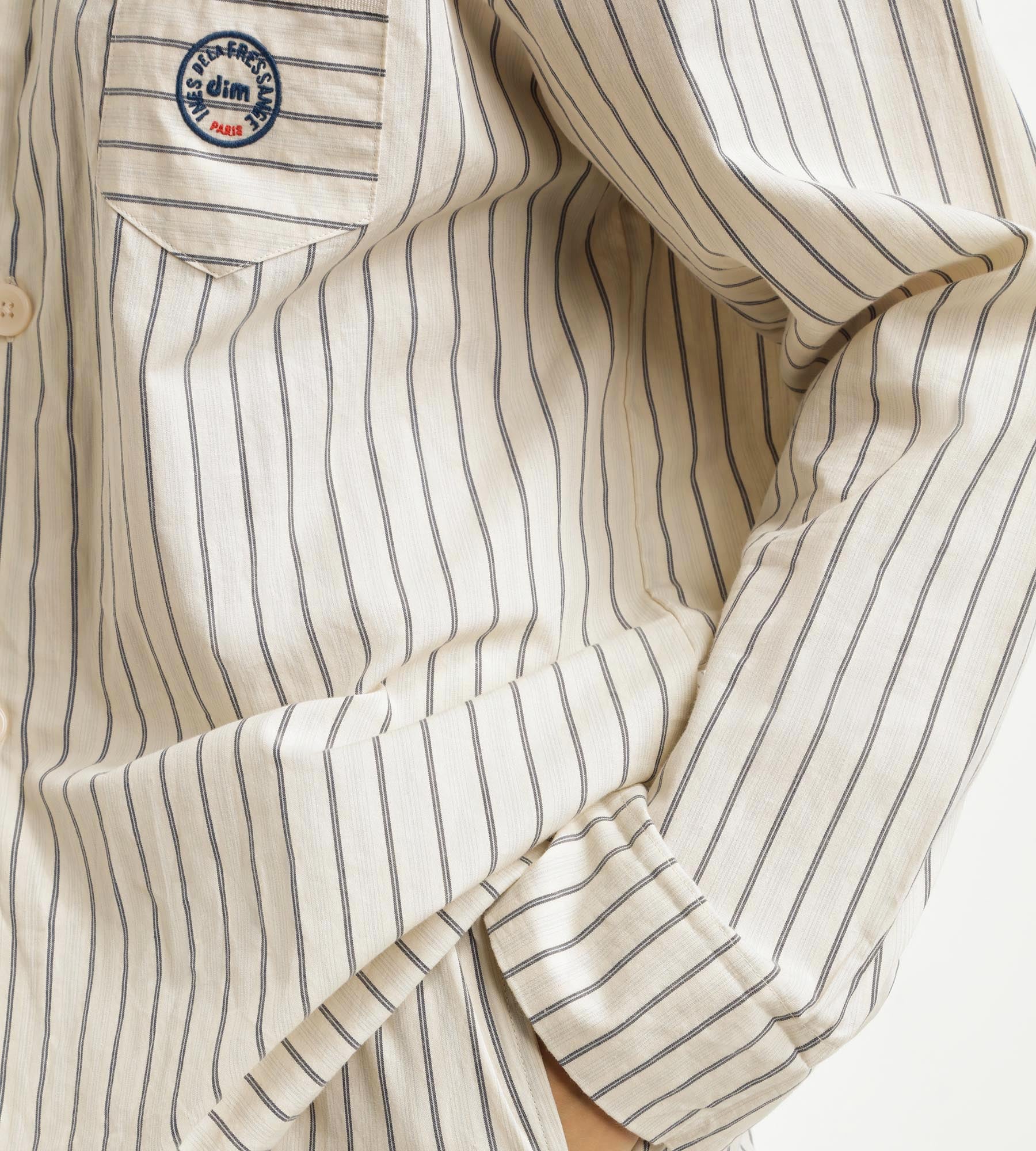 Dieses Pyjama-Set für Damen von Dim x Inès de La Fressange kombiniert Komfort und Stil mit seinem fließenden Material und den éléganten Streifen. Das légère à Hemd mit klassischem Kragen bietet einen raffinierten Look, der durch eine gestickte Brusttasche aufgewertet wird. Die gerade geschnittene Hose mit ihrem elastischen Gürtel sorgt für eine angenehme Passform, ohne einzuengen. Die vertikalen hell- und dunkelblauen Streifen auf beigem Grund strecken die Silhouette optisch und verleihen ihr einen frischen Touch. Ein schickes und zeitloses Modell für ruhige Nächte.