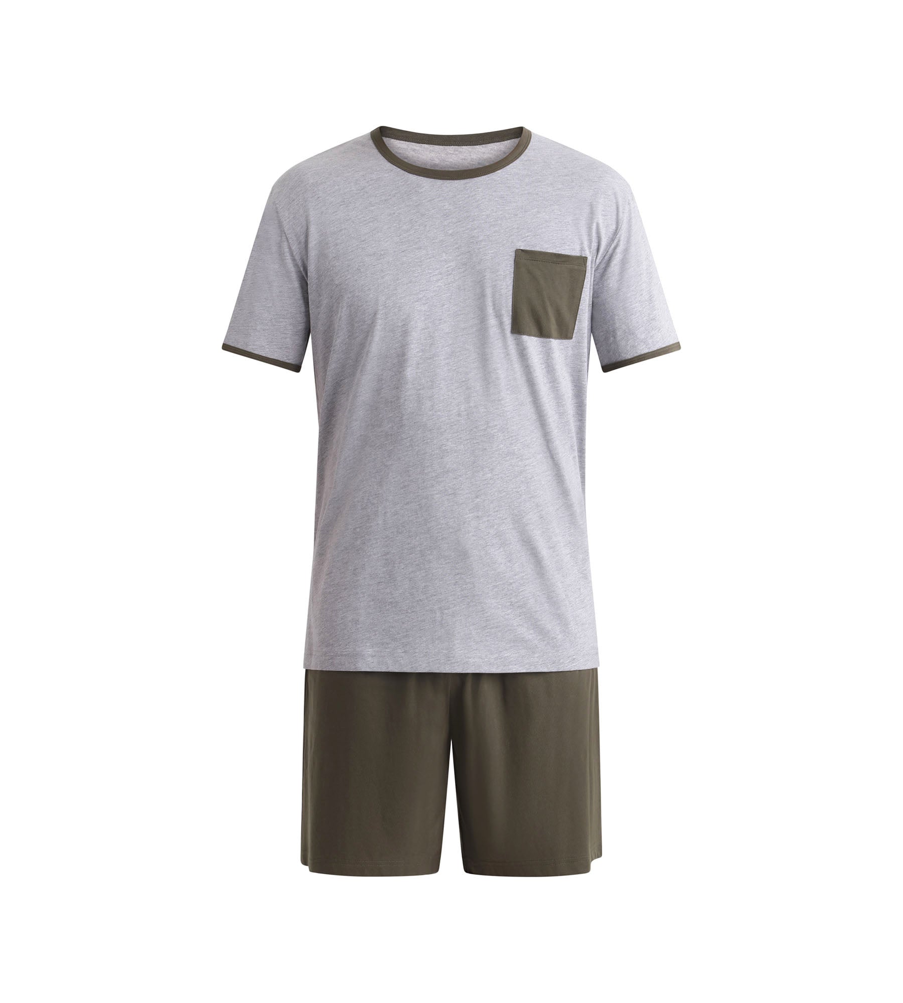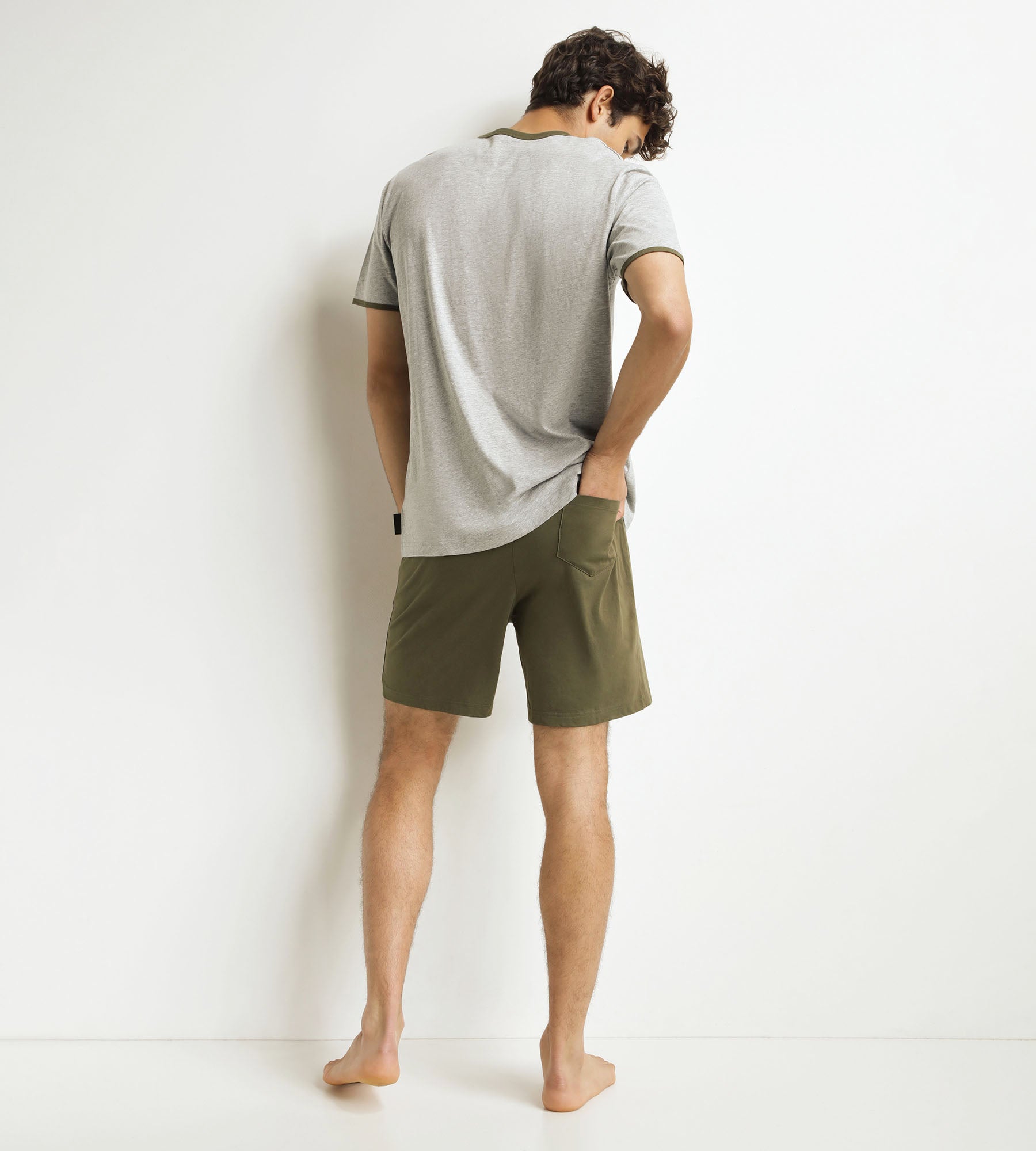 Entdecken Sie das Herren-Pyjama-Short-Set Dim Jersey in meliertem Grau und Khaki, leicht und zeitlos, Tag und Nacht zu tragen!