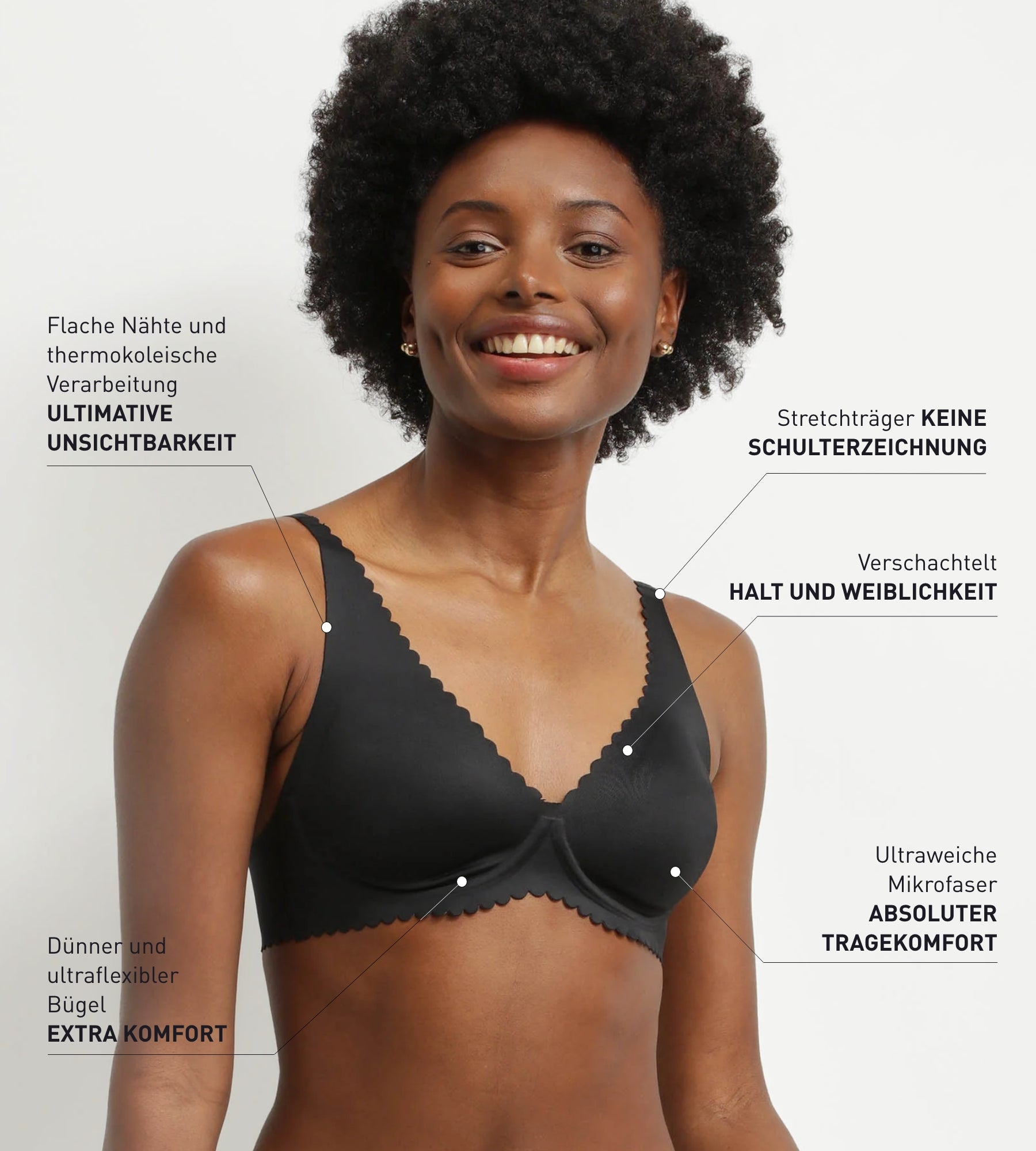 Seidig-leichte Mikrofaser schmiegt sich an wie eine zweite Haut, umhüllt und formt die Brust und sorgt für 100% Tragekomfort: Der schwarze Body Touch Bügel-BH macht seinen Job einfach richtig gut. Sein schmeichelhafter V-Ausschnitt mit weicher Wellenkante setzt Dein Dekolleté perfekt in Szene.
