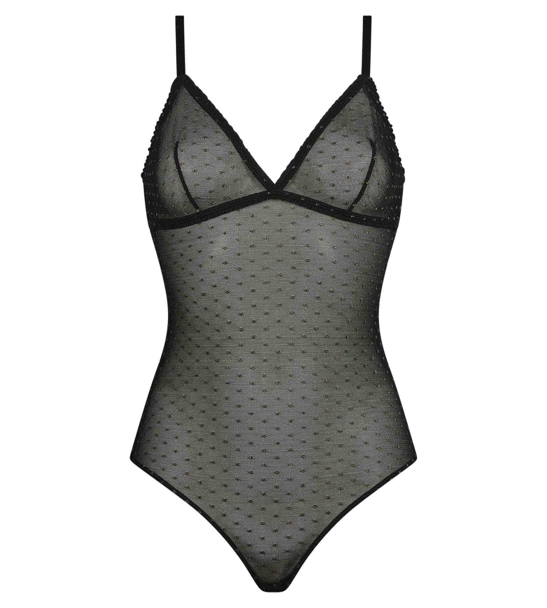 Schwarzer transparenter Body mit goldenen Lurex-Punkten - Shiny Mesh