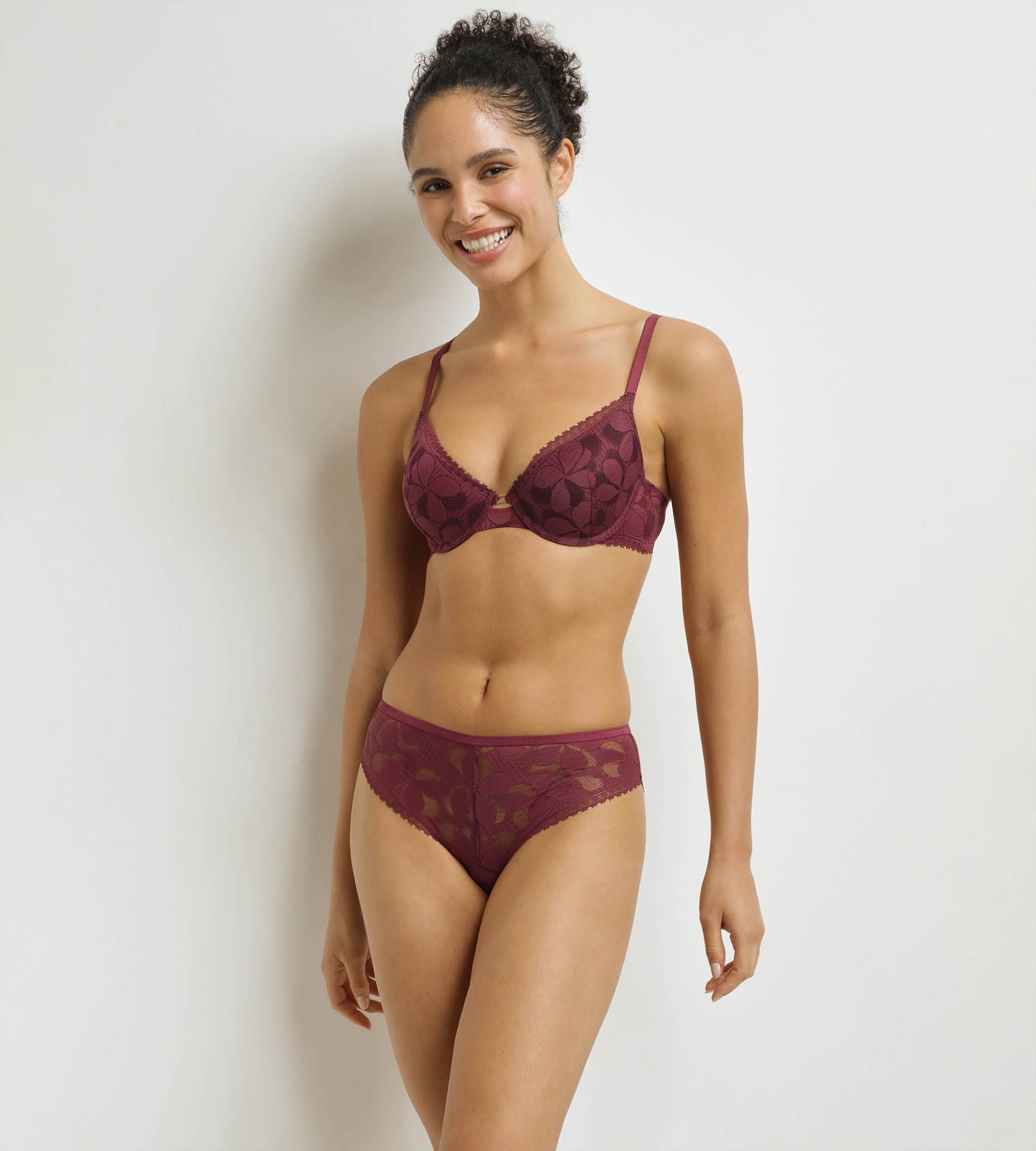 .Kombinieren Sie den Art Flower Spitzenslip mit einem Triangel-, Korb- oder Einlage-BH aus der gleichen Kollektion, in der passenden Farbe Feige oder in Orange!