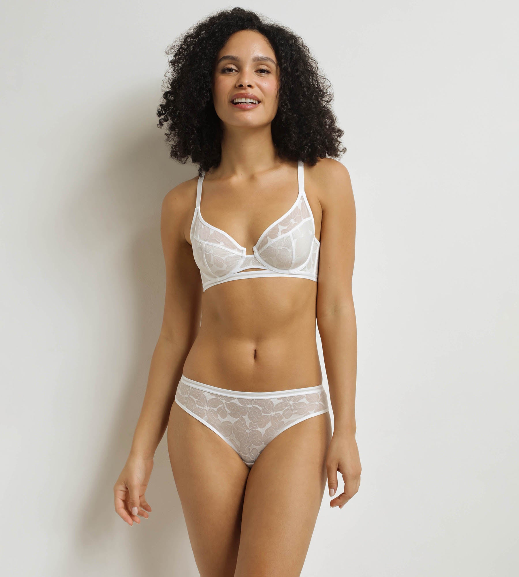 Sublimieren Sie Ihre Silhouette diskret und elegant mit dem Dim Bloom Damen Slip aus durchscheinender weißer Spitze.