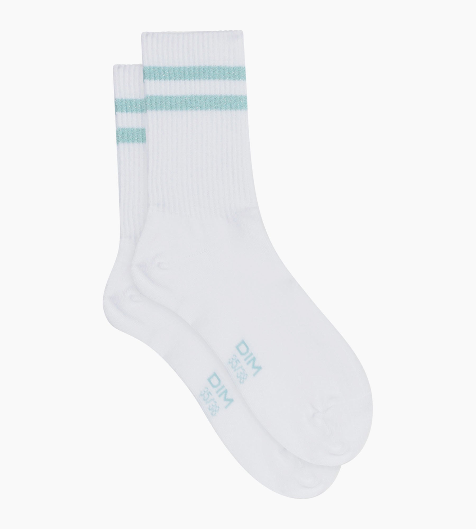 Die weißen Baumwollsocken für Damen von Dim Mode haben schmale blaue Lurexstreifen, die ihnen einen sportlichen Look mit femininem Touch geben.