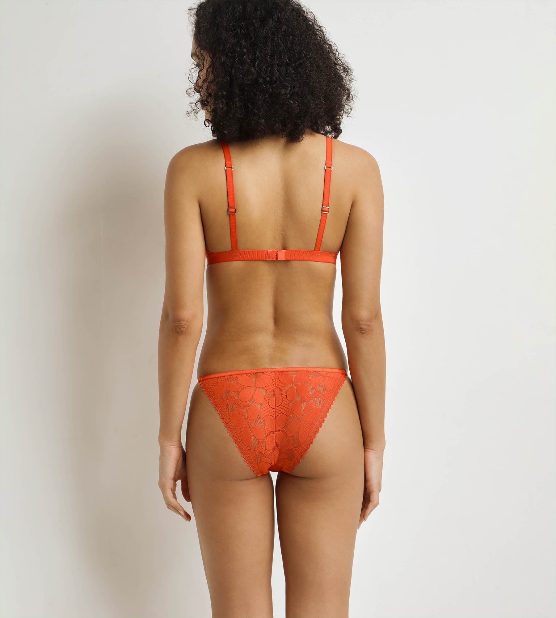 Zeige ein natürliches und strahlendes Dekolleté mit dem bügellosen Dim Art Flower Triangel-BH aus orangefarbener Spitze.