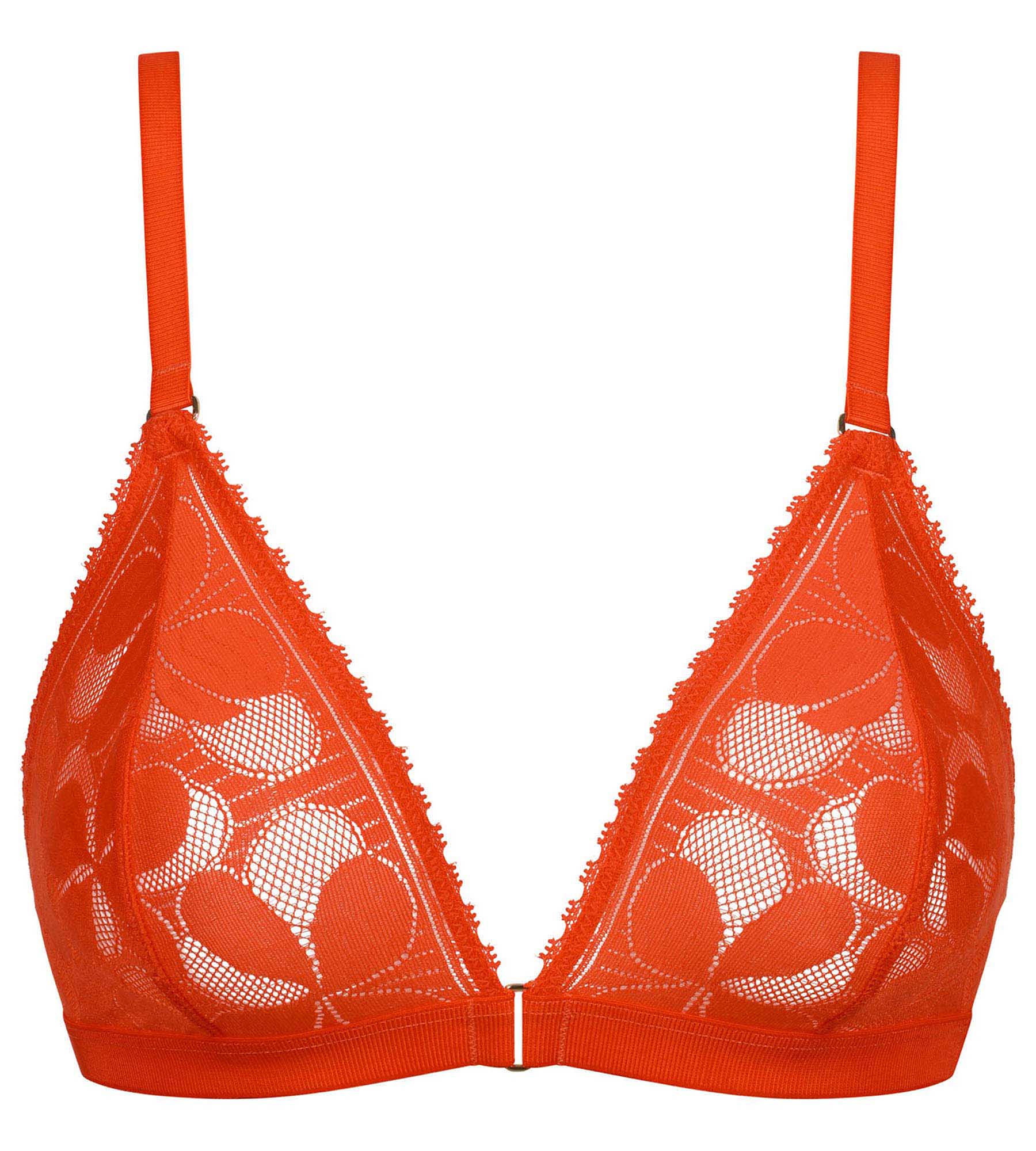 .Der Triangel-BH Orange Art Flower von Dim umhüllt mit seinem dunstigen Design die Brust, ohne sie einzuengen. Die grafische Blumenspitze betont den Halsausschnitt auf subtile Weise, während das elastische Unterbrustband für einen diskreten Halt im Alltag sorgt. Dieser Damen-BH ist ohne Bügel und Schaumstoff gefertigt und bietet ein unvergleichlich angenehmes Tragegefühl. Mit einem kleinen goldenen Schmuckstück in der Mitte und goldenen Details an den Trägern ist dieses Dessous ein echter Hingucker.